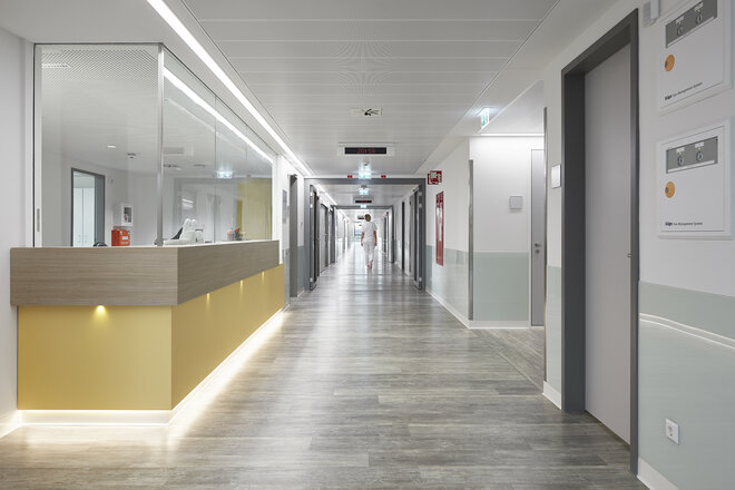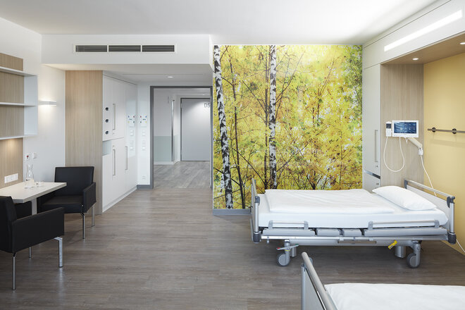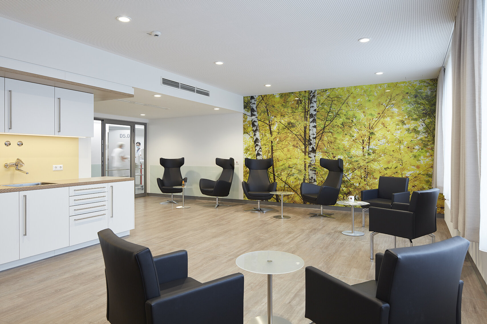 Im Innenbereich werden zarte, helle Farbtöne verwendet, die sich positiv auf das vegetative Nervensystem auswirken sollen. Jedes Pflegegeschoss zeichnet sich durch einen Signalton aus, der sich in verschiedenen Raumelementen widerspiegelt, so beispielsweise in den Leitstellen, den Flurwänden oder in den Patientenzimmern an Bettenrückwänden oder in Grafiken. So unterstützt auch die innenarchitektonische Gestaltung die Orientierung im Klinikum.