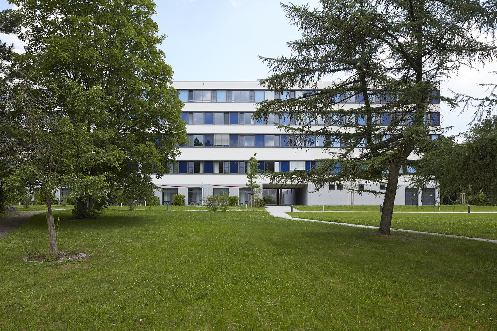 Die Fensterflächen des Neubaus werden als durchlaufende horizontale Bänder entwickelt, die in Öffnungsflügel und Glaspaneele in unterschiedlichen Blautönen unterteilt sind. Die farblichen Akzente stellen eine Verbindung des Farbkonzepts von innen nach außen dar und bilden einen harmonischen Übergang zur angrenzenden großen Parkanlage. Durch die Spiegelungen auf der blauen Glasflächen wird auch in der Außenbetrachtung ein Bezug zwischen den Elementen der umgebenden Natur, wie Bäumen und Himmel, und dem Klinikgebäude erreicht.