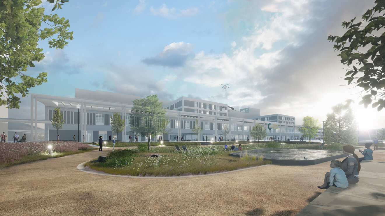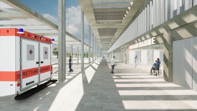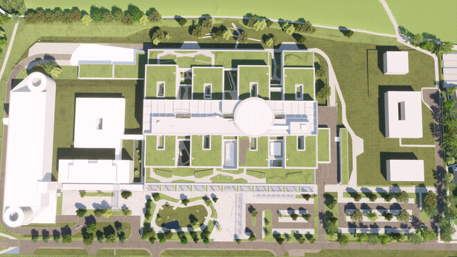 Im Kontext eines Generalplanungsauftrags wurde ein zukunftsfähiges Klinikum entwickelt, das optimale Prozessabläufe, hohe funktionale Flexibilität und eine ganzheitliche Patientenversorgung mit modernster Spitzenmedizin vereint. Im Mittelpunkt der Planung steht die Verbindung des Neubaus mit dem bestehenden Naturraum.