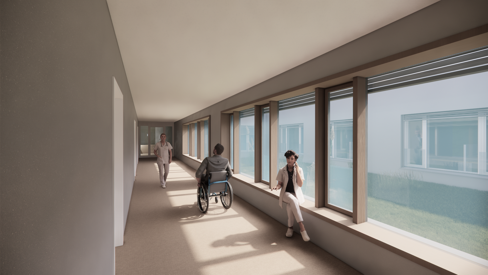 Zwischen den kammartig angeordneten Baukörpern entstehen großzügige Grünflächen, die Patient:innen, Besucher:innen sowie Mitarbeitenden Aufenthaltsqualität bieten – Orte für Begegnung und Rückzug im Einklang mit der Natur.