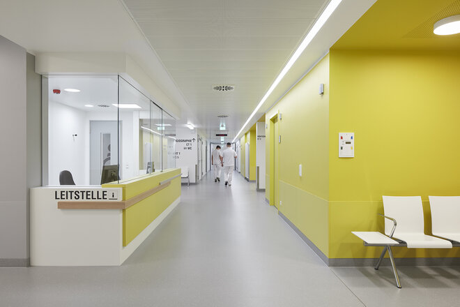 Das 7-geschossige Haus K entstand im 2. Bauabschnitt. Kompakt fügt es sich mit einem teilbegrünten Innenhof zwischen den 2012 in Betrieb genommenen Bau C und den Altbau. Leichte Orientierung schafft eine Magistrale, die vom Haupteingang aus alle Gebäudeteile miteinander verbindet.