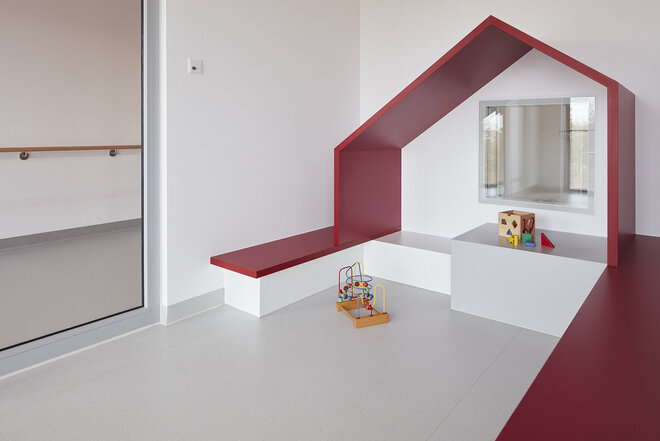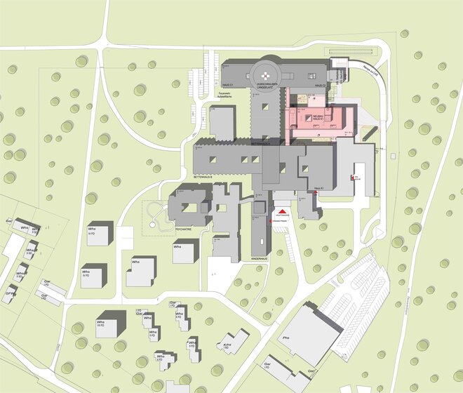 Die OP-Säle im 1. Obergeschoss legen sich L-förmig um den zentralen Baukörper mit einem Technikgeschoss auf dem Dach in Ebene 5. Alle neuen Funktionsbereiche sind so mit dem Bestand verknüpft, dass gut organisierte Funktionseinheiten mit kurzen Wegen entstehen. Diese Verzahnung zeigt sich auch in der Fassadengestaltung, deren Materialien sich am Bestand orientieren.