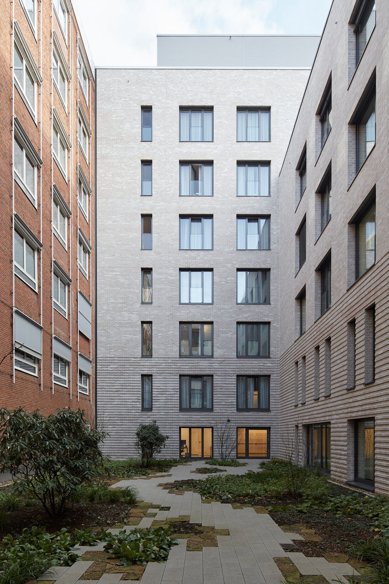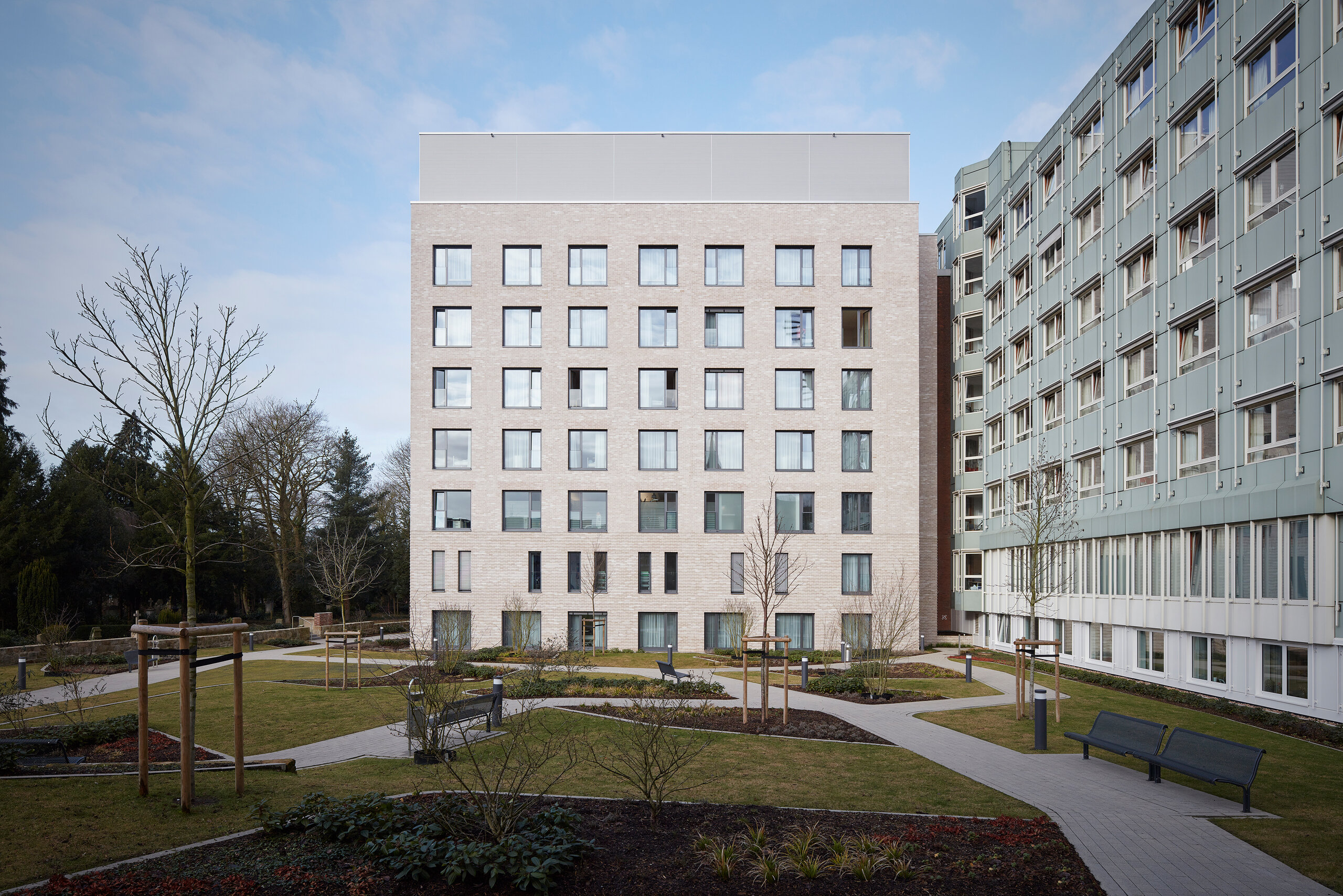 Den 7-geschossigen Erweiterungsbau positionierten a|sh architekten im südlichen Bereich des Parks. Auf einer Bruttogeschossfläche von 16.687 m² nimmt er neue Funktionsbereiche und eine Wahlleistungsstation auf. Über einen Ringschluss sind die oberen fünf Ebenen sowohl funktional als auch optisch mit dem umstrukturierten Bestand zu einer Einheit mit effizienter Wegeführung verbunden. Die Patientenzimmer öffnen sich mit großen Fenstern zum Park. An der klar gegliederten Fassade setzt sich der Sockelbereich mit den beiden unteren Geschossen von den darüber liegenden Patientenzimmern ab. Zwischen Alt- und Neubau entstand ein begrünter Innenhof.