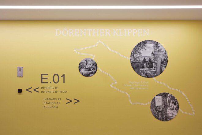 Die Achse des Haupteingangs wurde auf der Ebene 0 in den Neubau verlängert und neue Aufzugsgruppen sowie ein Bettenaufzug angegliedert. Um kurze Wege für Patienten zu schaffen und die interdisziplinäre Zusammenarbeit zu fördern, befinden sich nun fast alle Bereiche der Diagnostik auf dieser Ebene. Angebunden an die OP-Abteilung und Notaufnahme nimmt die Ebene 01 alle High Car-Abteilungen auf. Ein modernes OP-Konzept verkürzt die Wechselzeiten und gewährleistet eine optimale Versorgung der Patienten. Auf der Ebene 02 entstand eine weitere Allgemeinpflegestation, die gemeinsam mit der Station B im Altbau den Ringschluss bildet. Arztdienstbereiche wurden verlegt, um mehr Raum für die medizinische Pflege zu gewinnen. Der Pflegestützpunkt – als erste Anlaufstelle der Patienten – befindet sich nun näher am Haupttreppenhaus und Übergang zum Neubau.