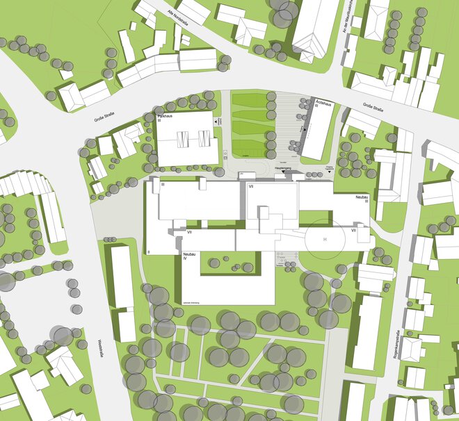 Viele Jahre lagen die Kliniken St. Elisabeth und von Bodelschwingh in Ibbenbüren rund 500 m Luftlinie voneinander entfernt – was zu erheblichen Transportwegen zwischen Aufnahme und Diagnostik, Doppelvorhaltungen und Synergieverlusten führte. Beide Kliniken sollten nun am Standort St. Elisabeth zusammengeführt werden und mit modernen, flexiblen Strukturen auf veränderte Anforderungen reagieren. Für a|sh architekten, die den 1. Preis im Gutachterverfahren erhielten, lautete die Bauaufgabe: Umstrukturierung des Bestandes und Ergänzung eines Neubaus.