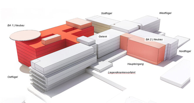 Der 7-geschossige Neubau wird die bestehenden Klinikflächen südöstlich des Funktionstraktes sinnvoll ergänzen. Um die notwendige Fläche zu schaffen, werden im Vorfeld die Wäscherei abgebrochen, die Feuerwehrumfahrt umgelegt und Installationen im Baufeld verlegt. Das Flachdach des Neubaus wird einen Landeplatz für Hubschrauber aufnehmen, der über zwei redundante Aufzüge die Notaufnahme, den OP und die Intensivstation direkt andient. In seiner Höhenentwicklung wird der Neubau die Geschosshöhen des Bestandes aufnehmen und mit dem Bettenhaus verbunden sein. Die Anschlüsse sichern die Rettungswege zum OP und sind für eine funktional verbesserte, kreuzungsfreie Anbindung der Angiographie an die zentrale Sterilgutversorgung erforderlich.