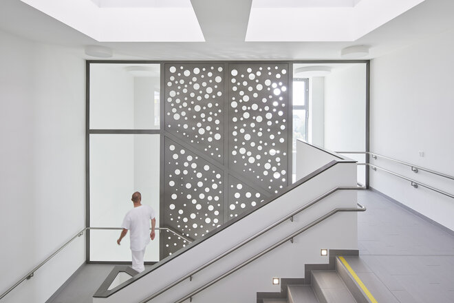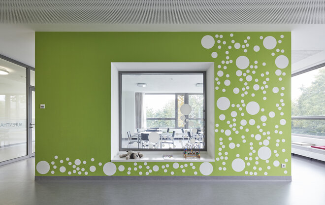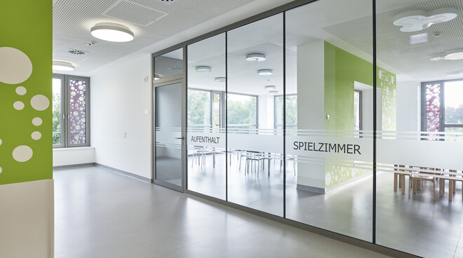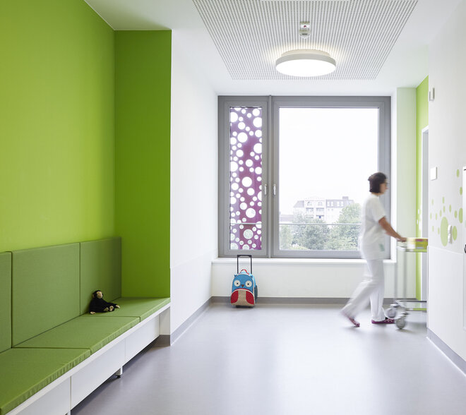 Die Klinik für Kinder- und Jugendmedizin des Klinikums Worms erhielt zum fünften Mal in Folge das Gütesiegel „Ausgezeichnet. Für Kinder“. Ein besonderes Anliegen der Klinikleitung ist es, den stationären Aufenthalt für die kleinen Patienten möglichst angstfrei zu gestalten. a|sh widmen sich dem Bauen für Kinder mit viel Leidenschaft. Die Innenräume und Fassaden sind mit liebevollen Details ausgestattet. Leicht, unbeschwert und lebendig sollen die Räume und die Architektur wirken – wie farbige Seifenblasen. Große Kreise tanzen über Wände und Türen. Gelochte farbige Bleche erzeugen beruhigende Licht- und Schattenspiele. Sie geben dem Kinderkrankenhaus seine ganz eigene Stimmung, lenken sanft vom Klinikalltag ab und geben den Kindern ein Gefühl von Geborgenheit.