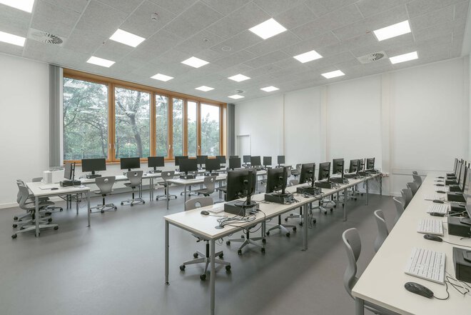 Das Clusterkonzept in den Klassenraumbereichen haben wir erstmals im Rahmen eines Berufskollegs umgesetzt. Dabei sind je zwei mal drei Klassenräume um einen offenen Lernbereich gruppiert, ergänzt durch einen Sanitärbereich und einen Lehrmittelraum. Die Verkehrsfläche wird hier zu einer schulisch nutzbaren Fläche aufgewertet. Das Schulgebäude ist teilunterkellert mit Fachräumen für Gestaltungstechnik, Gesundheit-Motorik und Erziehung sowie Räumen zur Lagerung und Archivierung. Im östlichen Gebäudeteil ist eine Technikzentrale untergebracht.
