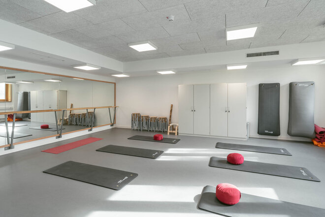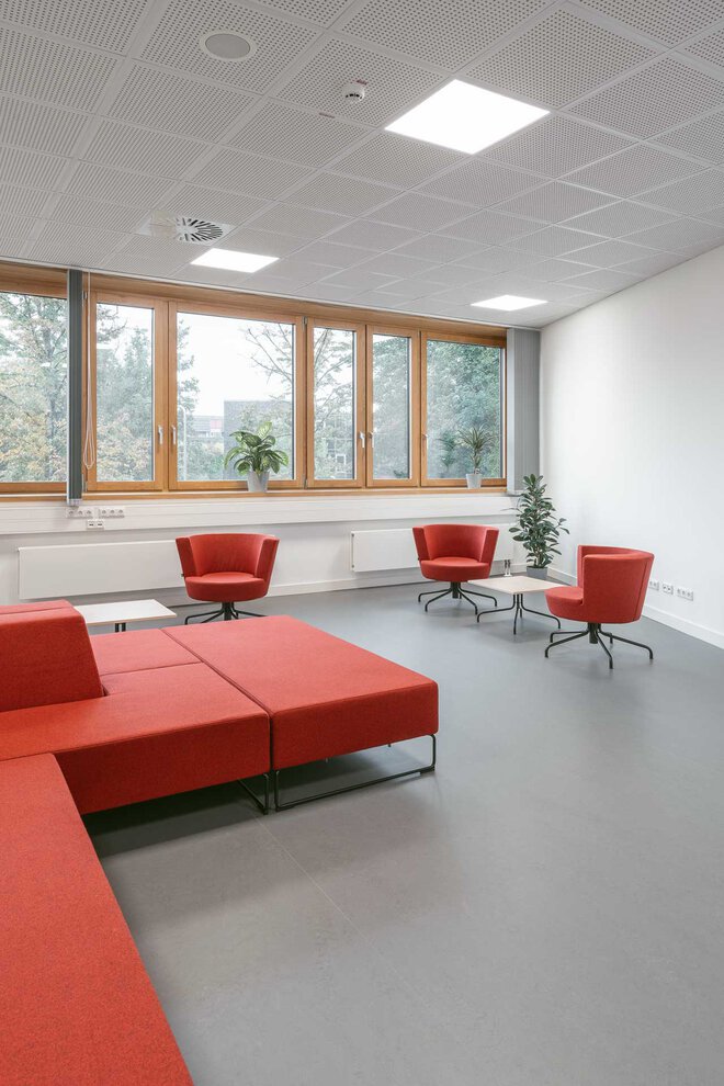 Der Bereich für die Lehrpersonen mit Gemeinschaftsraum und weiteren Besprechungsräumen schließt sich im östlichen Teil über dem Haupteingang an. Auch hier findet sich das fließend ineinander gehende Sitzmöbel als Aufenthaltsbereich wieder – in leuchtendem Grün. Im 2. Obergeschoss liegen an der Halle die naturwissenschaftlichen Fachräume mit Sammlungsraum. Im östlichen Teil befindet sich die Bereichsleitung, im nördlichen Teil ein weiterer Computer- und ein Klassenraum.