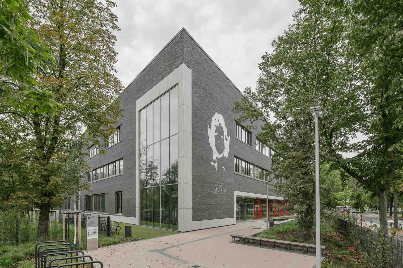 Auf dem Gelände der Lore-Lorentz-Schule in Düsseldorf entwickelten wir nach Abbruch des Bestandes einen 3-geschossigen kompakten Neubau mit begrüntem Flachdach. Der polygonal ausgeformte Baukörper öffnet sich mit seinem farblich hervorgehobenen Eingangsbereich dem gegenüberliegenden Bestandsgebäude mit ebenfalls drei Geschossen und symbolisiert die Kommunikation der Schulstandorte über die Straße hinweg. Im Inneren wurden die Funktionsbereiche Aula, Unterricht und Verwaltung neu gegliedert. Herzstück des modernen Berufskollegs mit beruflichem Gymnasium ist die helle Eingangshalle mit einer Sitztreppe, die den neuen gemeinschaftlichen Mittel- und Treffpunkt bildet.