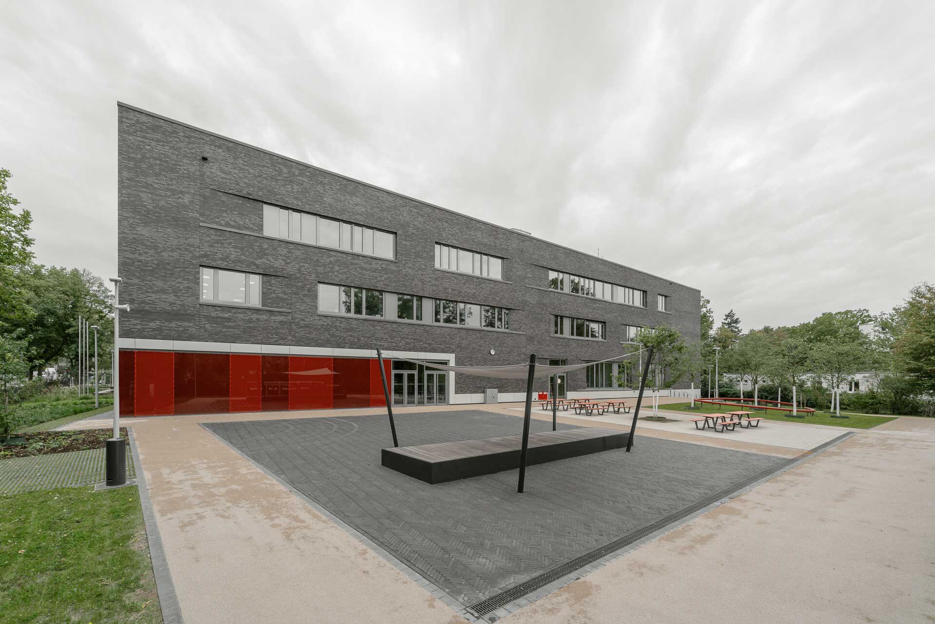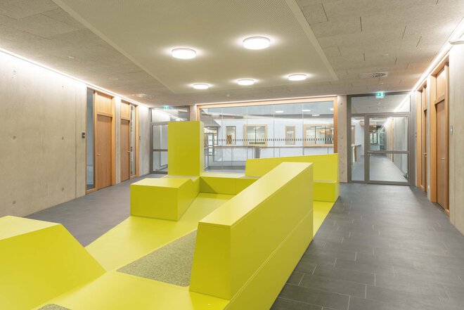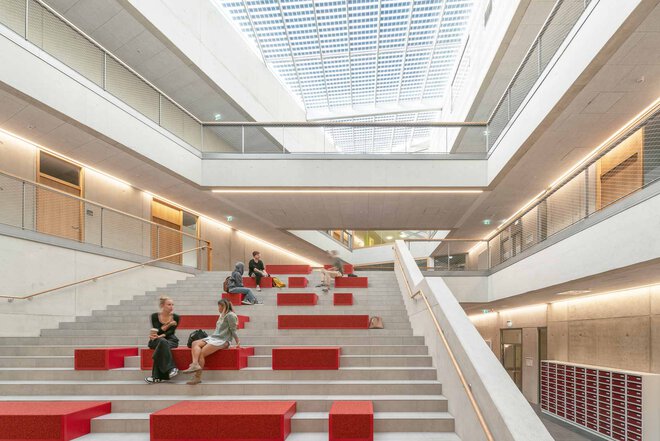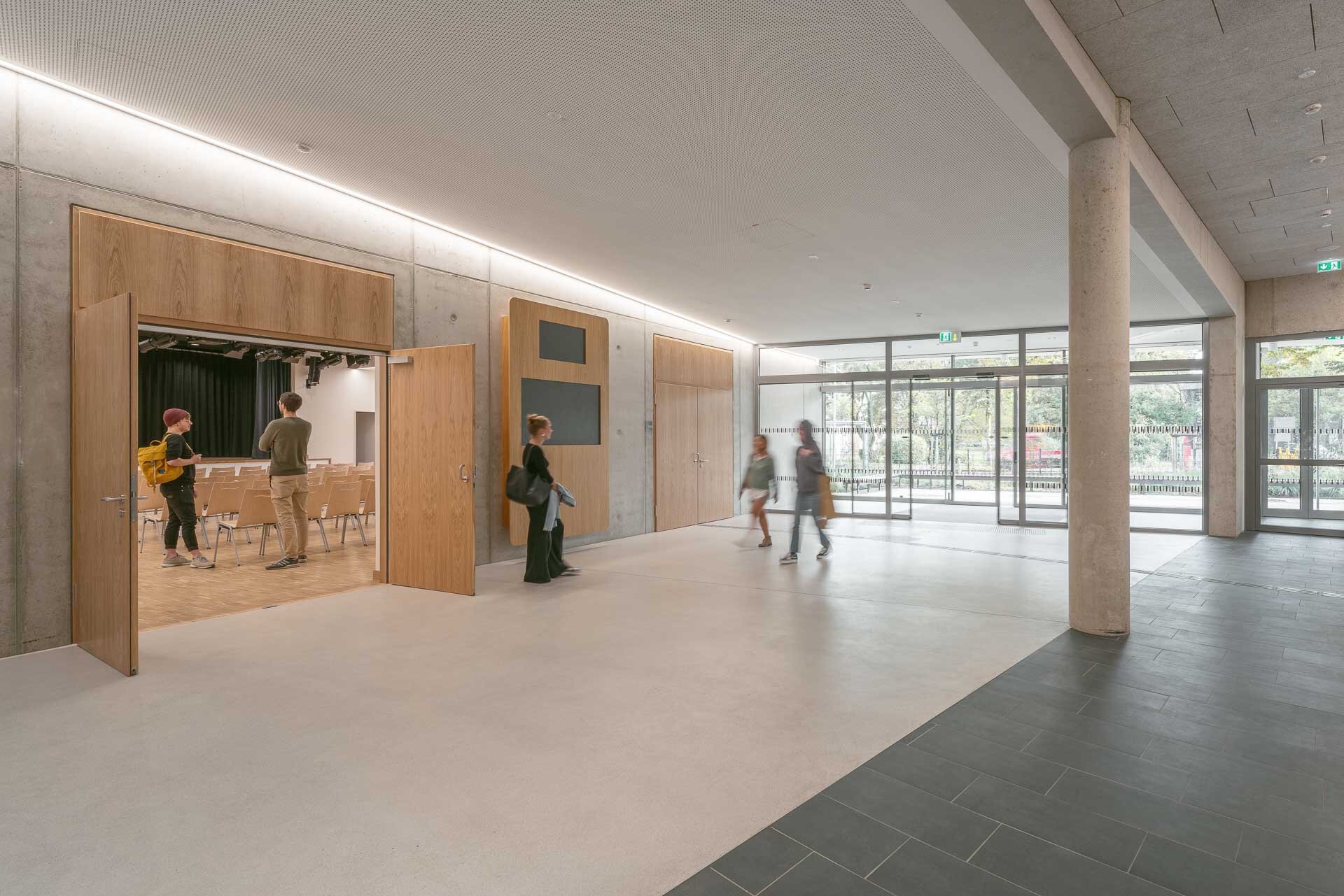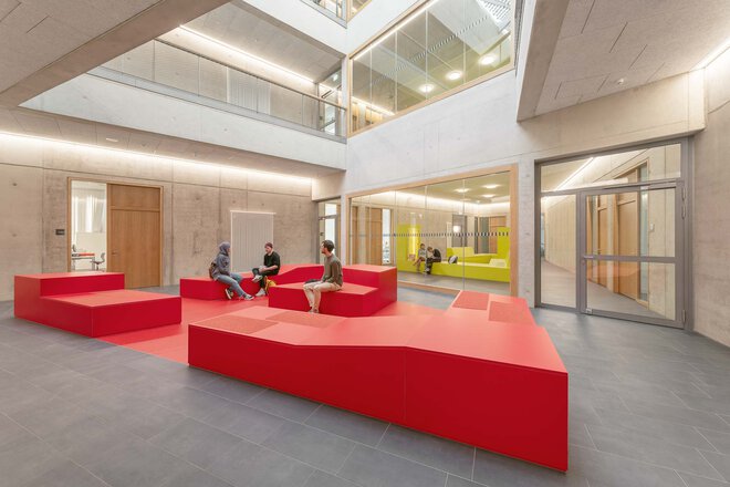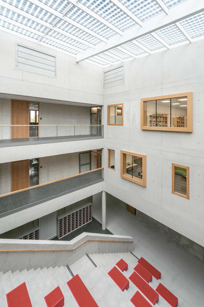 Durch das Foyer gelangt man in die Halle, den zentralen Erschließungs- und Aufenthaltsort mit der großen Sitztreppe als kommunikatives Zentrum und „Herz der Schule“, das über den Luftraum über alle Geschosse als prägend wahrgenommen wird. Die Sitztreppe erschließt auch die Verwaltung, das Schulbüro und Sekretariat im 1. Obergeschoss und kann für Veranstaltungen genutzt werden. Ein Kiosk an der Rückseite orientiert sich zum Aufenthaltsbereich mit einem fließend ineinander übergehenden Sitzmöbel in kräftigem Rot.
