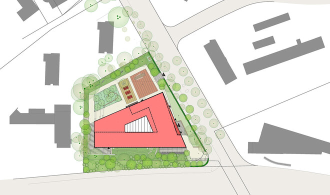 Über die beiden Gebäuderiegel – den roten mit der abgeschrägten Eingangsfassade und den herausgedrehten mit Klinkerfassade – setzt der Neubau eine prägnante und identitätsstiftende Aussage an diesem besonderen Standort. Der ansteigende Attikaverlauf wirkt dabei als Kontrapunkt zur schräggesellten Eingangsfassade über die Straße und übersetzt den polygonalen Grundriss in den Raum.