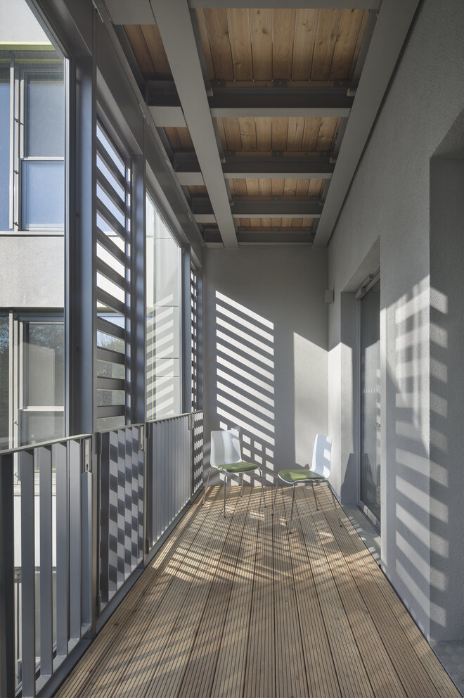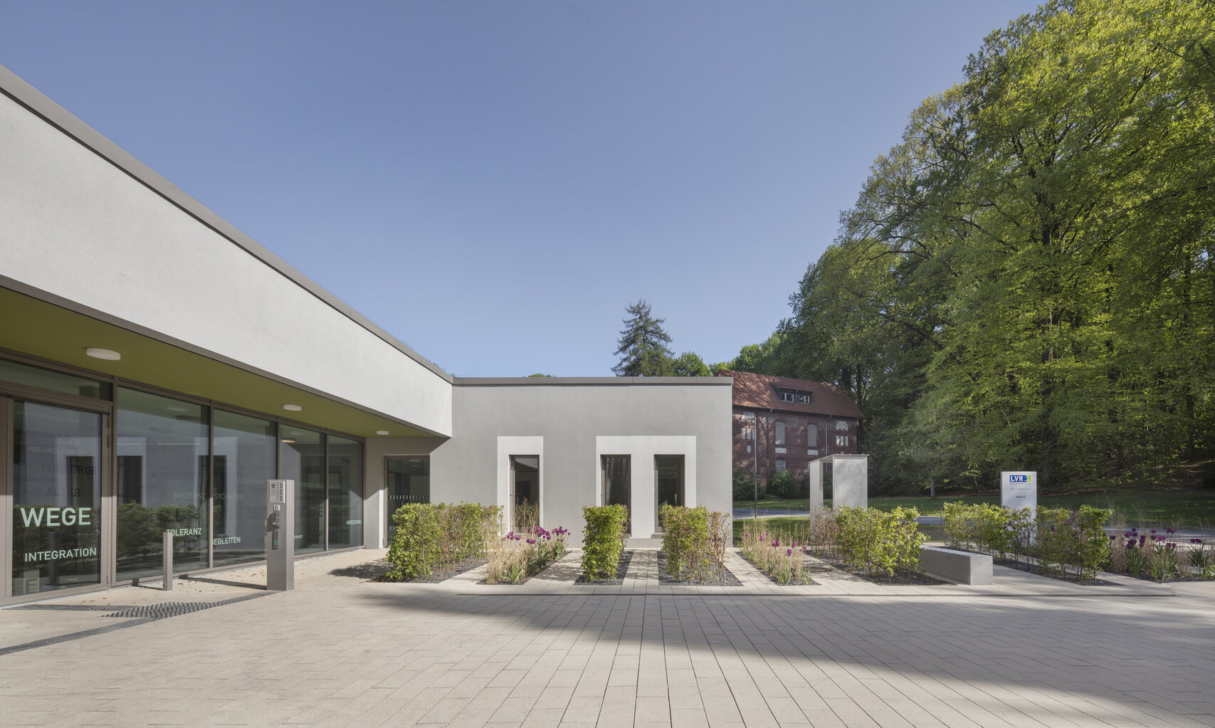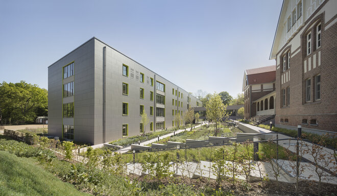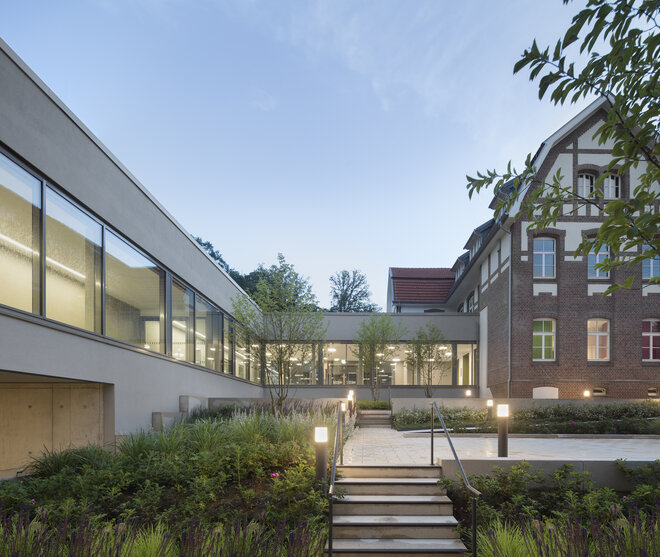 Zwischen dem denkmalgeschützten "Haus 12" und dem Neubau wurde in enger Abstimmung mit der Bodendenkmalpflege der historische, abfallende Terrassengarten auf moderne Weise interpretiert und bildet somit einen geschützt liegenden Freibereich mit hoher Aufenthaltsqualität.