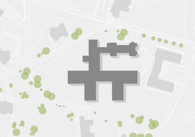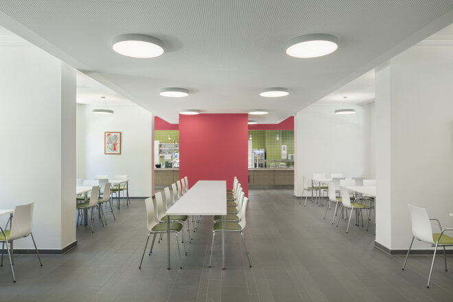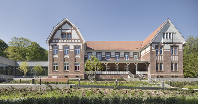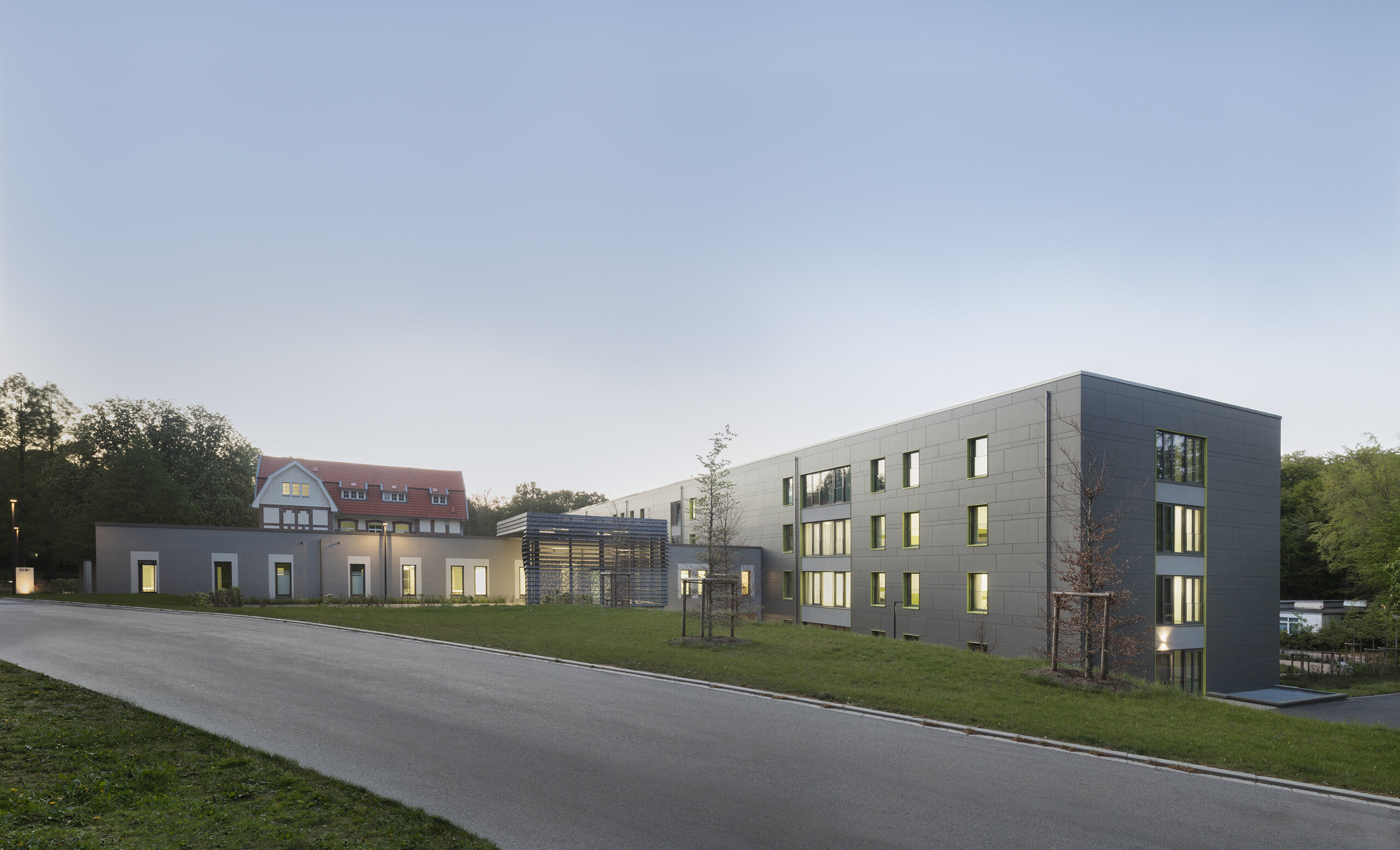 Die Lage in einer parkähnlichen Landschaft dient als Gestaltungsansatz und nimmt das Thema Natur in Ihrer Farbigkeit im und am Gebäude konzeptionell auf. Das denkmalgeschützte „Haus 12“ wurde in enger Abstimmung mit der Denkmalpflege kernsaniert und wird als öffentliche Cafeteria genutzt.
