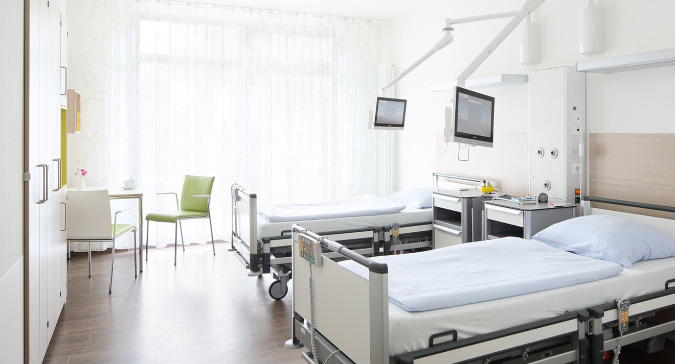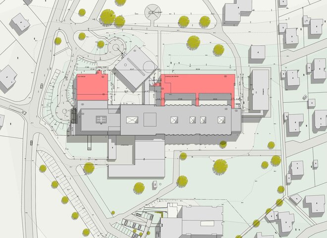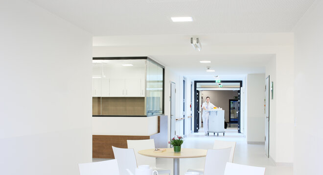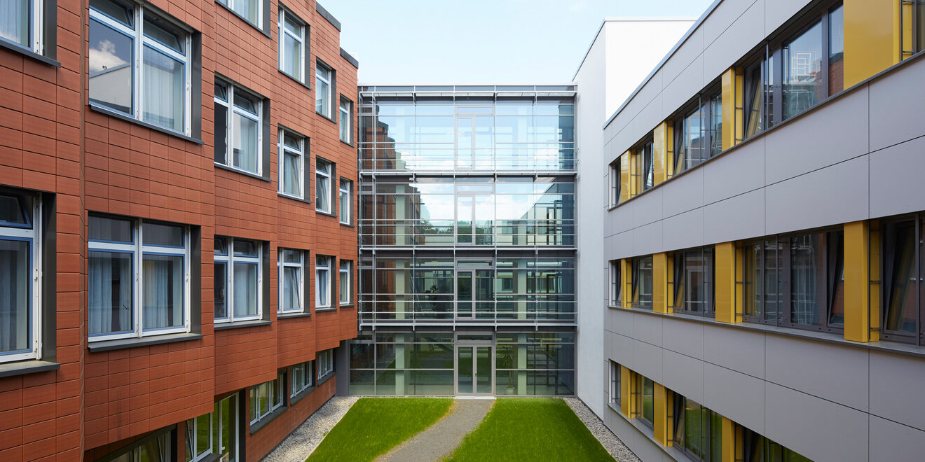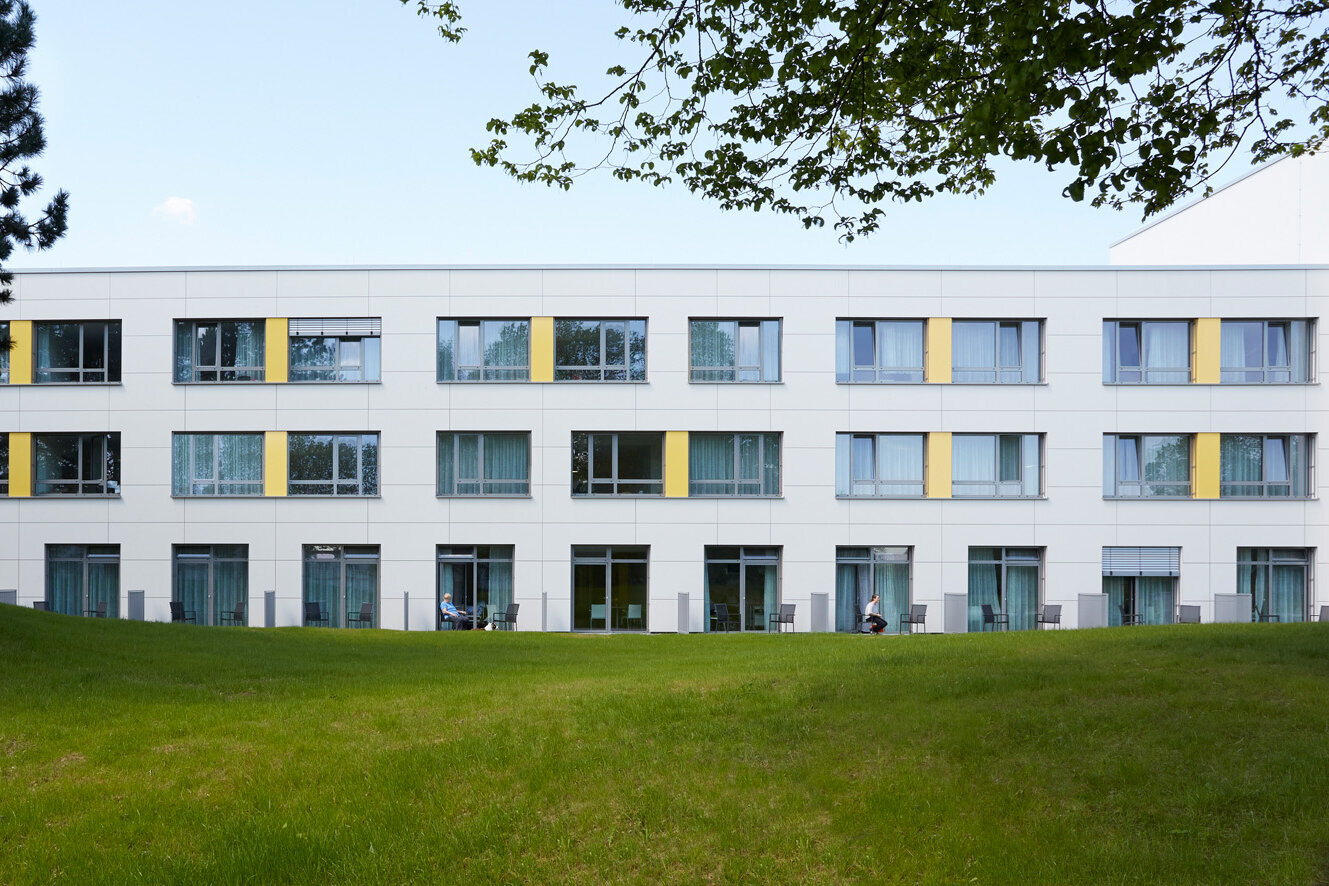 Der dreigeschossige Erweiterungsbau der Pflegebereiche ist direkt an den Bestandsbettenbau angebunden. Im Bereich des Funktionsbaus wurde eine neue zentrale Patientenaufnahme mit direkter Anbindung an den Bestand geschaffen. ln den Obergeschossen des Anbaus sind Arztpraxen untergebracht, die das Spektrum des Krankenhauses ergänzen.