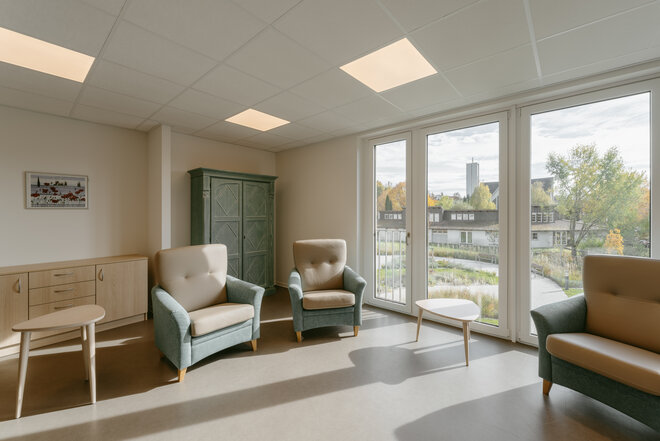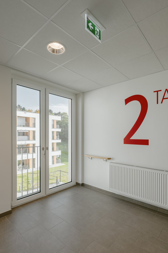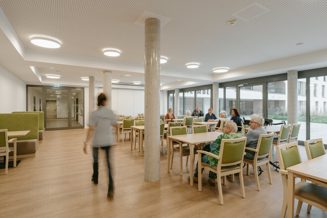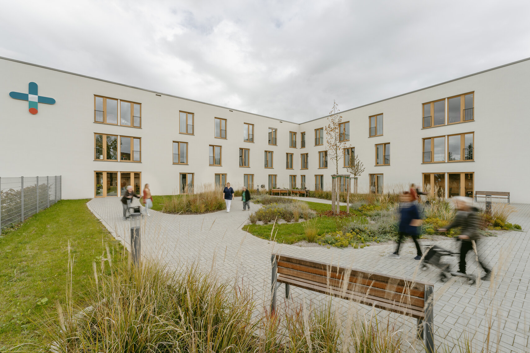 Ein speziell auf die Bedürfnisse dementer Bewohnerinnen und Bewohner abgestimmter Demenzgarten mit ebenerdigem Zugang ergänzt den Außenbereich, Barrierefreiheit und Aufenthaltsqualität standen im Vordergrund des Entwurfs. Im Schnittpunkt des Gebäudes befinden sich die zentralen Haupterschließungen, Aufenthaltsbereiche und Pflegestützpunkte, die den Zugang zu den Wohnbereichen erleichtern. Auf den Stationen bieten jeweils zwei Einheiten mit 15 Zimmern einen Rundlauf durch das Geschoss, was die Orientierung erleichtert, und Bewegungsfreiheit schafft.