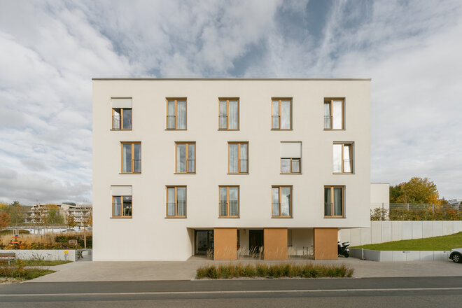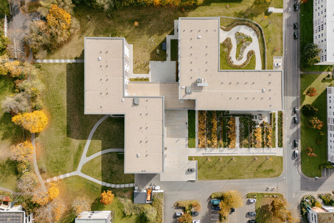 Der Gebäudekomplex besteht aus zwei dreigeschossigen Baukörpern, die durch einen gemeinsamen Erschließungstrakt verbunden sind. Die Anordnung des Pflegebaukörpers folgt einer „L“-Form, wobei eine terrassierte Vorgartenzone parallel zum Gebäude und zum Parkplatz verläuft. So entstehen attraktive Außenbereiche, die zum Verweilen einladen.