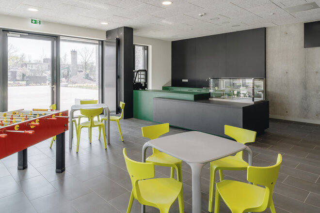 Die energetische Versorgung erfolgt über eine Luft-Wärmepumpe und eine Redundanzanbindung an das neue Nahwärmenetz der Liegenschaft. Auf dem Flachdach befindet sich eine Photovoltaikanlage, die den Neubau mit Strom versorgt.