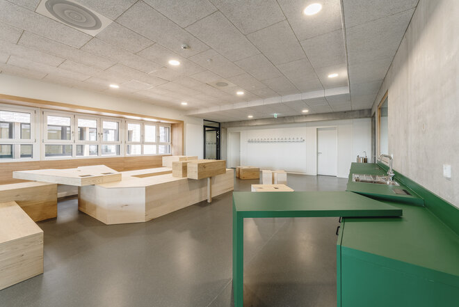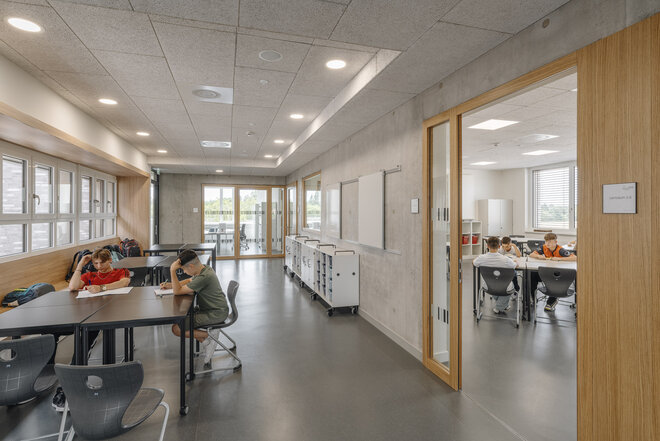 Der Ausweich- oder Gruppenraum dient der Differenzierung und Inklusion der sechs Lerngruppen im Cluster. Durch seine Lage am Clustereingang ist auch eine Nutzung durch eine Lerngruppe aus dem Fachunterricht, eines anderen Clusters oder durch die Ganztagesbetreuung möglich. Vor allem aufgrund der Clusterung der allgemeinen Lernräume und der reduzierten Erschließungsflächen wird ein günstiges Verhältnis von Bruttogeschossfläche zu Nutzfläche von 1,60 erreicht. Barrierefreie Erschließungen des Gebäudes und taktile Systeme beispielsweise am Boden ermöglichen auch beeinträchtigten Kindern die Schule zu besuchen.