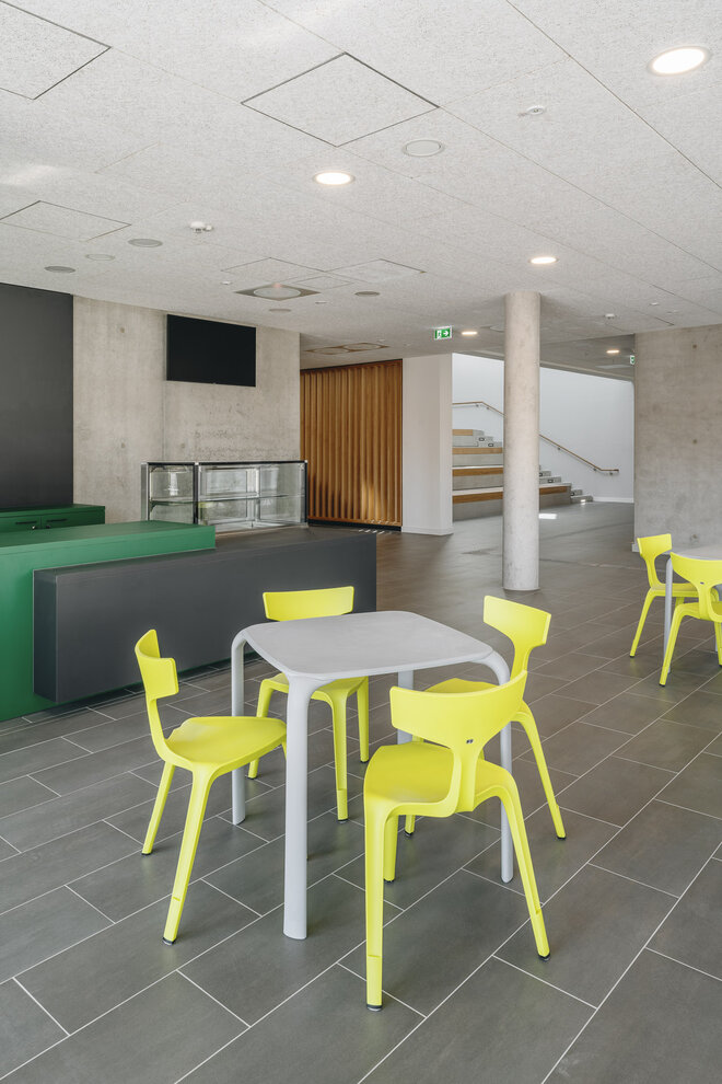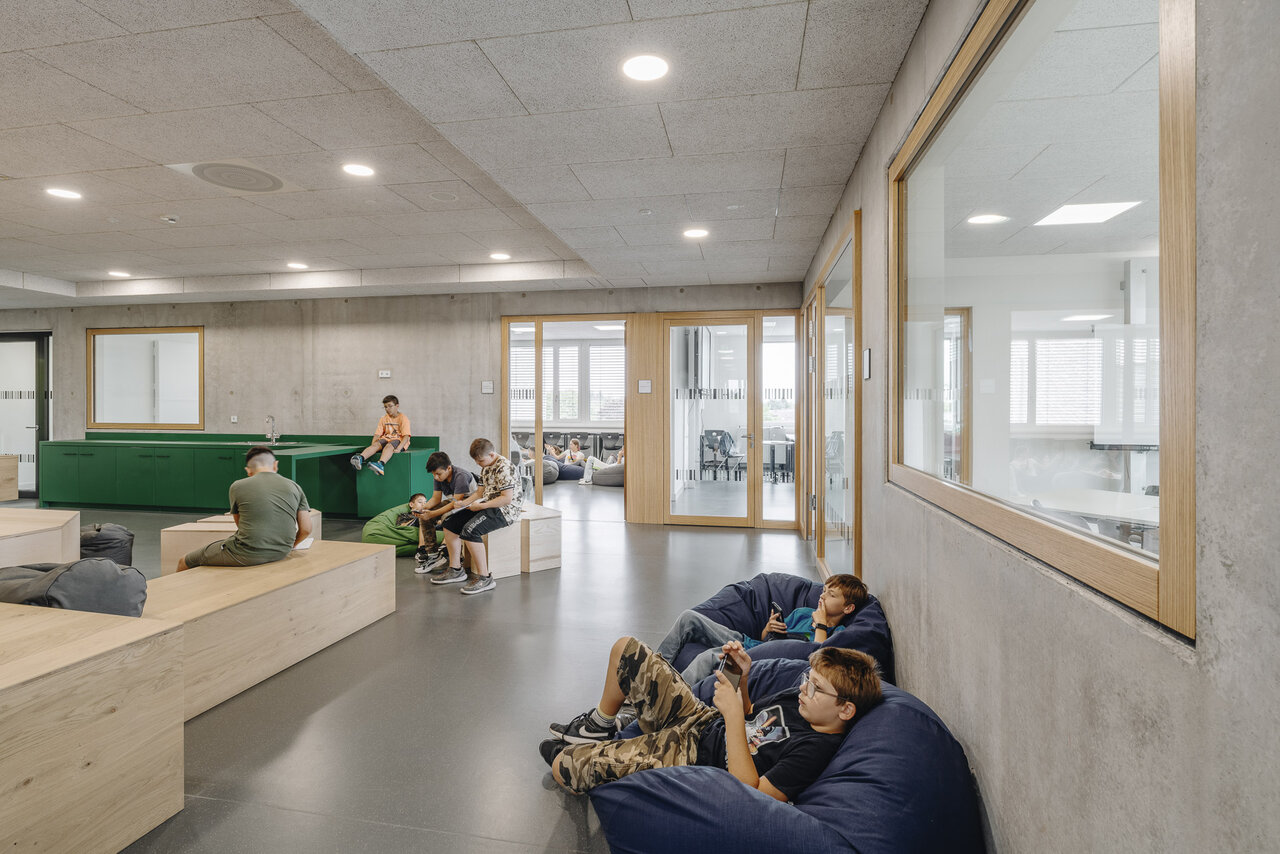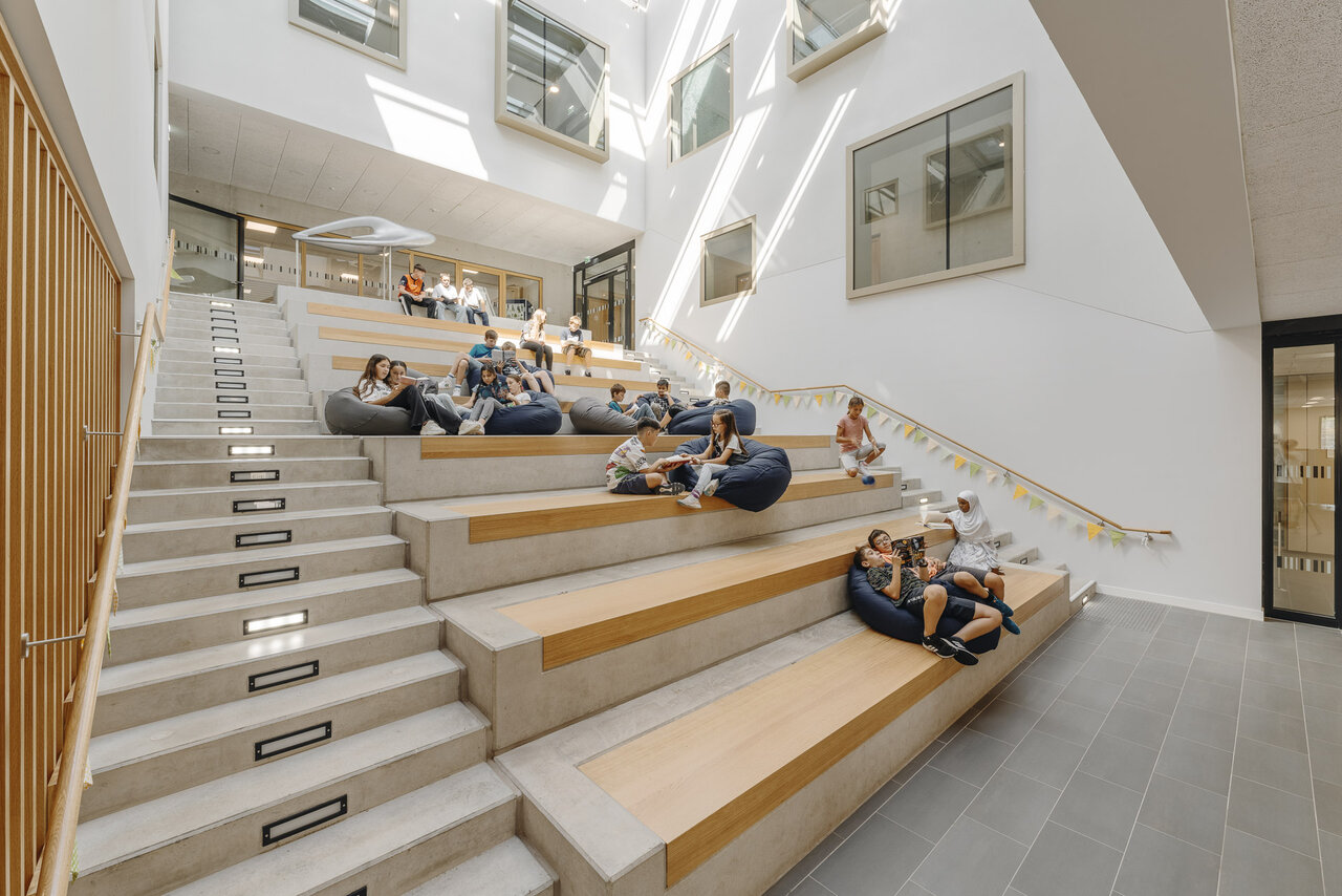 Die offene Sitztreppe ist das neue „Herz der Schule“ und bietet mit dem zuschaltbaren Musikraum die Möglichkeit für Präsentationen, Feierlichkeiten sowie Versammlungen und vermittelt die Idee einer demokratischen Schule. Aus dem Erdgeschoss bietet die Sitztreppe den Zugang ins 1. Obergeschoss mit der Schülerbibliothek, dem Computerlabor und den Fachsälen des Kreativbereichs. Über den Luftraum ist das 2. Obergeschoss mit den Naturwissenschaften und der Lehrküche visuell angebunden.