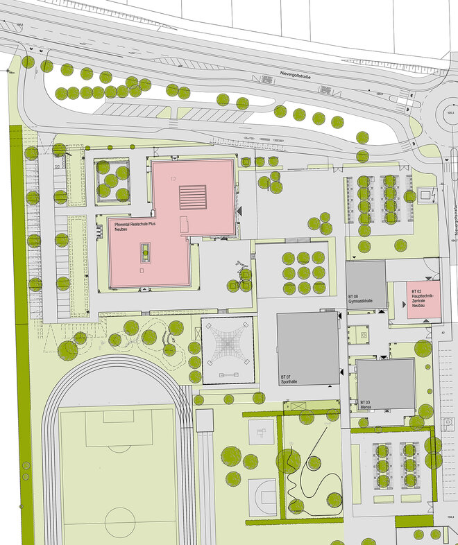 Die Pfrimmtal Realschule Plus vereint zwei bisherige Standorte und formt mit der auf dem Grundstück befindlichen Diesterweg Grundschule, der Mensa sowie der Gymnastik- und der Sporthalle einen neuen Bildungscampus in Worms. Eine Campus-Magistrale verknüpft den Ankommensplatz im Norden mit allen Gebäuden. Da die Stadt Worms östlich angrenzend an die Liegenschaft ein neues Wohngebiet plant, ist der Schulcampus über Nebenzugänge an die Bebauungsstruktur angebunden. Mit ihren Doppeljahrgangsclustern ist die Schule auf individuelles und kompetenzorientiertes Lernen ausgerichtet, bei dem die Lehrenden zu Begleitenden werden. Die kompakte Bauform erzielt ein wirtschaftlich günstiges Verhältnis der Außenflächen zum Gebäudevolumen. Das Gebäude unterschreitet die aktuellen Anforderungen der EnEV 2014 und die Wärme wird ausschließlich über erneuerbare Energien erzeugt.
