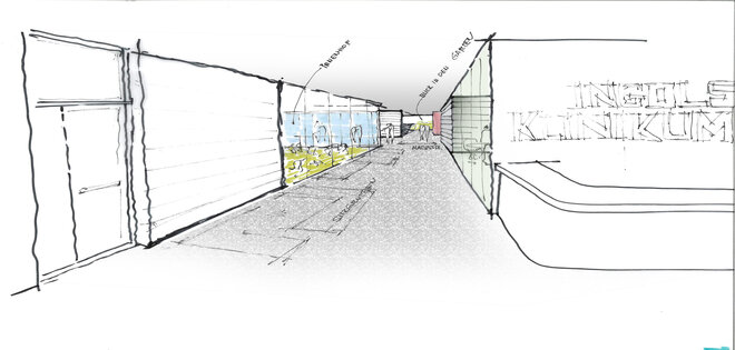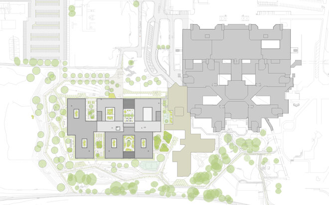 Nach Süden und Westen verzahnen sich die Baukörper mit der Außenanlage, so dass die Grünflächen und der Patientenpark förmlich in die Innenhöfe hineinfließen. So entstehen die für Therapie und Heilung wichtigen Freibereiche. Die geschlossen geführten Stationen erhalten auf der Ebene 01 geschützten Außenbereiche. Der öffentliche Patientenpark ist an die Freiflächen der Somatik angebunden und steht den offen geführten Stationen zur Verfügung. Auch die Ergo- und Sporttherapie nutzt die Freiflächen als Erweiterung ihres Bereiches.