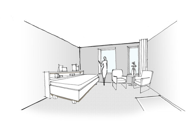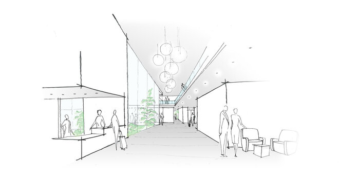 Die sechs klar ablesbaren Baukörper lagern sich an eine zentrale Magistrale an, die auf kurzen Wegen die Hauptaufzugsgruppe, drei Haupttreppenhäusern und eine freie Treppenanlage anbindet. Sie nimmt zudem sämtliche Zugänge zu den einzelnen Funktionsbereichen als abgeschlossene Einheiten auf und ermöglicht eine klare Abstufung von öffentlichen zu geschlossenen Nutzungen. Übergeordnete Sondernutzungen wie Patiententreff, Clubraum, Patientenbibliothek und Besprechungsräume erzeugen mit der Magistrale und dem Haupttreppenhaus ein erlebbares Spiel wechselseitiger Lichteinfälle.