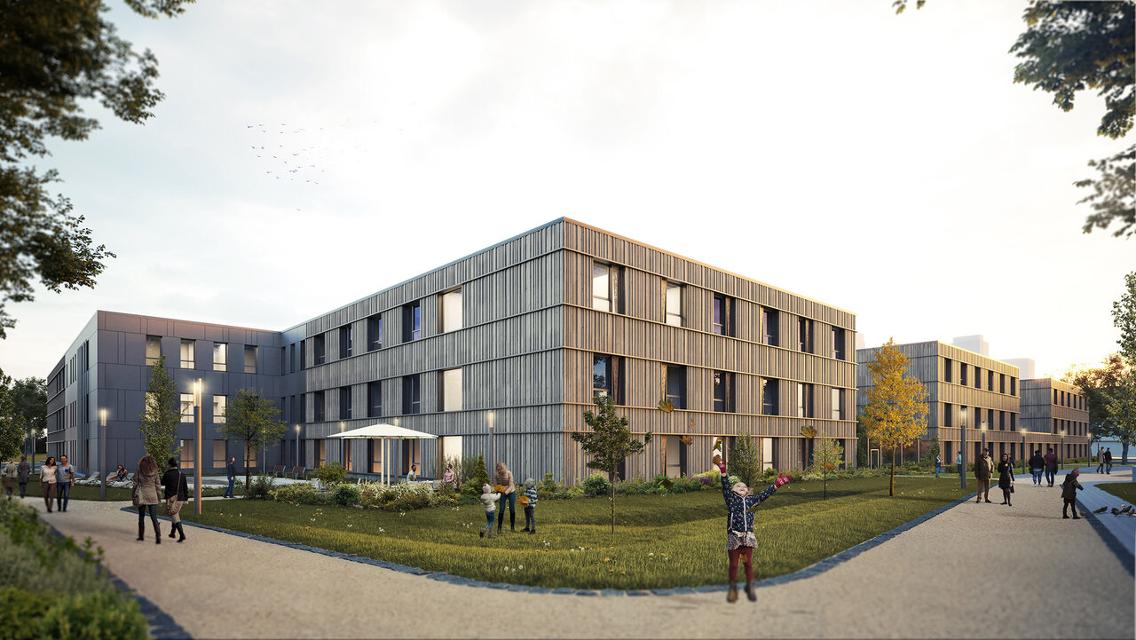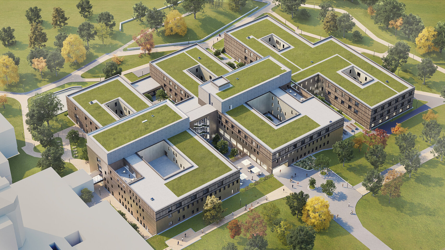 Für den Neubau des Zentrums für psychische Gesundheit entwickelten wir eine pavillonähnliche Struktur aus sechs Atriumhäusern, die mit einem Maximum an natürlich belichteten Flächen der psychiatrischen Ausrichtung gerecht wird und über eine Magistrale alle Bereiche verbindet. Die Umsetzung des Neubaus erfolgt in zwei Bauabschnitten bei laufendem Klinikbetrieb und beinhaltet den sukzessiven Abbruch der Bestandsgebäude der Psychiatrie.
