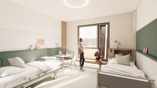 Für die geschlossen geführten Stationen stehen auf Ebene 01 geschützte Außenbereiche zur Verfügung, die einen sicheren Aufenthalt im Freien ermöglichen. Die offen geführten Stationen sind direkt mit dem öffentlichen Patientenpark verbunden. Großzügige Fensterflächen öffnen die Patientenzimmer zum Freiraum hin, während breite Fensterbänke zusätzliche Sitzgelegenheiten bieten.