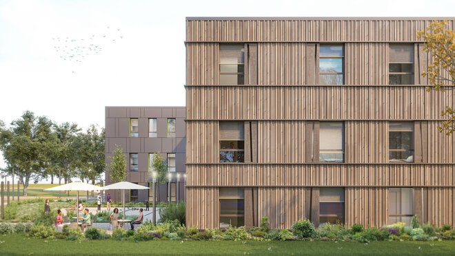 Die Gebäudehülle besteht überwiegend aus einer vorgefertigten Holzständerkonstruktion mit einer zu zwei Dritteln aus Holz bestehenden Fassade. Dadurch lassen sich die CO₂-Emissionen erheblich reduzieren.