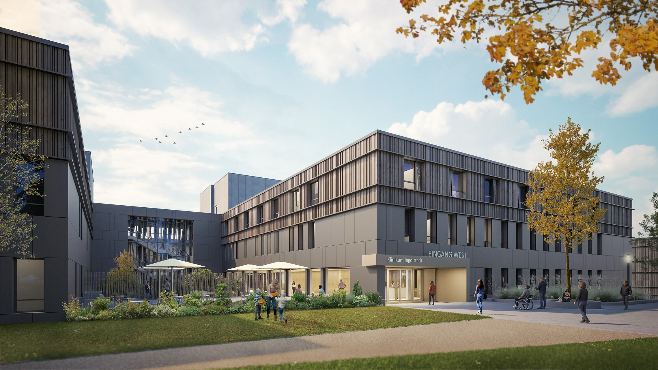 Der Neubau der Psychiatrie erhält einen eigenen Eingang, der über einen Vorplatz erschlossen wird und sich auf der gleichen Ebene wie der Zugang zur Somatik befindet. Durch den Einschnitt in den Baukörper ist der Eingang geschützt und klar erkennbar. Durch eine unterschiedliche Materialität der Fassanden werden die verschiedenen Bereiche der Psychiatrie deutlich erkennbar: Während auf den Pflegestationen alle Patientenzimmern eine warmtonige Holzfassade erhalten, ist für die allgemeinen Pflegebereiche, die Therapie und die Verwaltung eine Fassade mit Metallpaneelen, die den angenehmen Farbton des Holzes aufnimmt, geplant. Nach Süden und Westen wird das Gebäude durch eine dreidimensional vertikale Holzstruktur geprägt, die in horizontal verlaufenden Bändern (Brandschürzen) unterteilt ist. Die dahinter liegenden Patientenzimmer werden über eine großzügige Festverglasung und einen schmalen, suizidsicheren Drehflügel mit viel Tageslicht versorgt und die breite Fensterbank bietet zusätzliche Sitzmöglichkeiten.