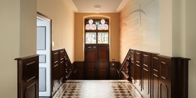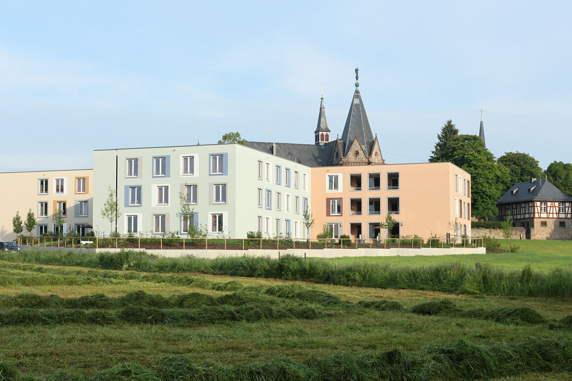 Nach der Errichtung des Neubaus wurde auch das neugotische Bestandsgebäude behutsam saniert, um darin künftig 14 Appartements für Betreutes Wohnen anbieten zu können.
