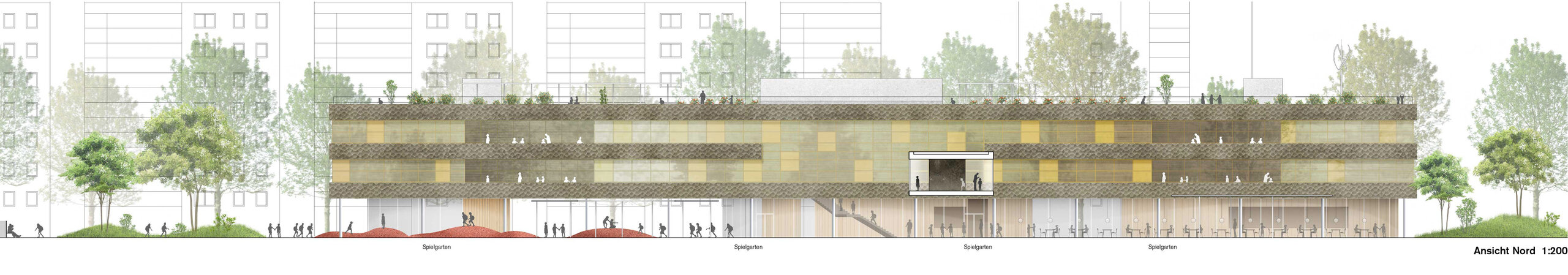 Landschaftsinseln, Schuldachgarten als Experimentierlandschaft und Ginkgo-Bäume - viel Raum zum Bewegen, Spielen und Ausruhen. Mitwirkung - es bestehen vielfältige Möglichkeiten zur Mitwirkung von Schülern, Lehrern und Eltern bei der Ausgestaltung des Freiraumes - insbesondere auf dem Dachgarten.