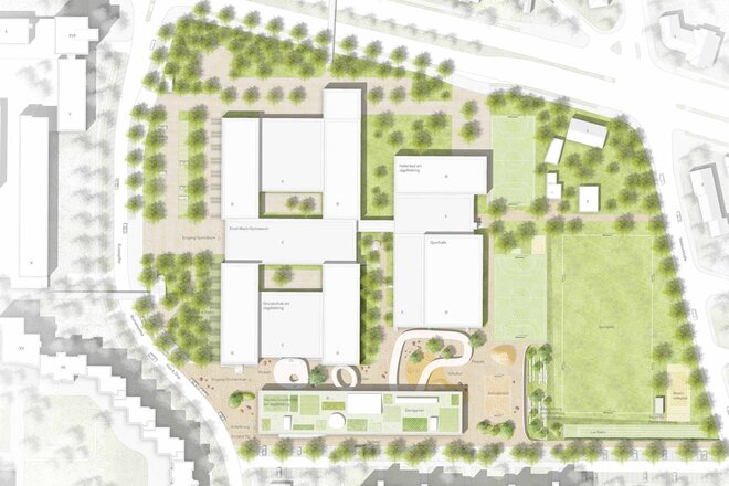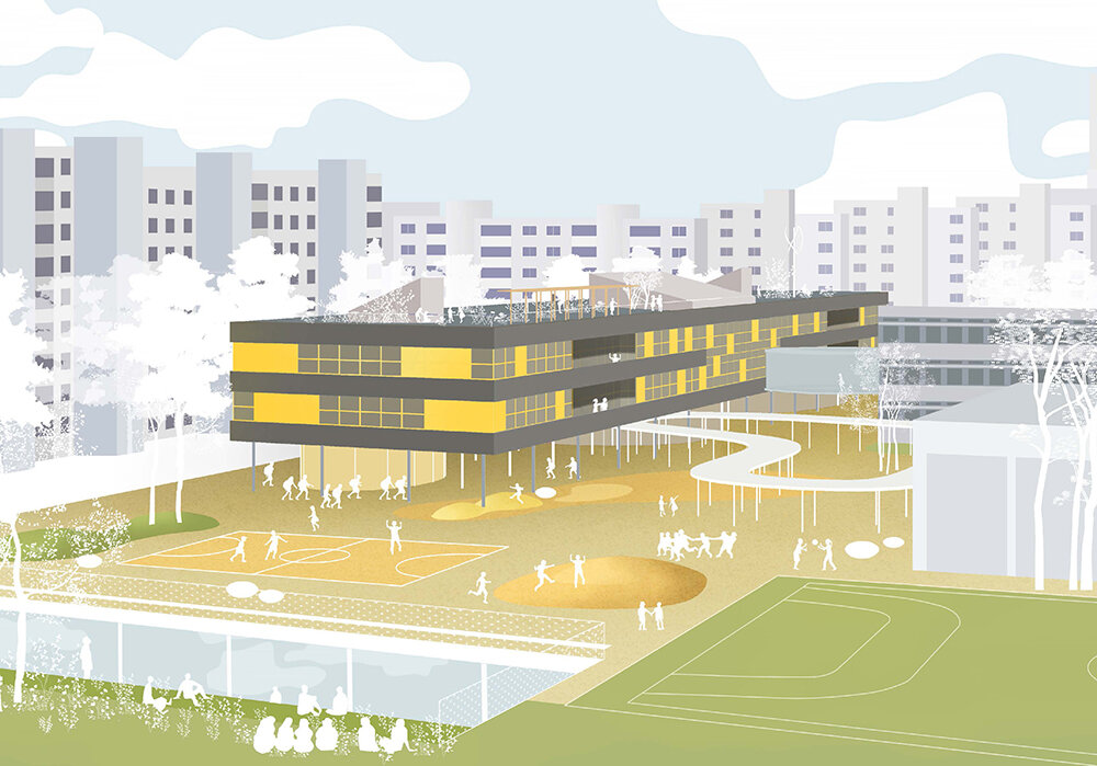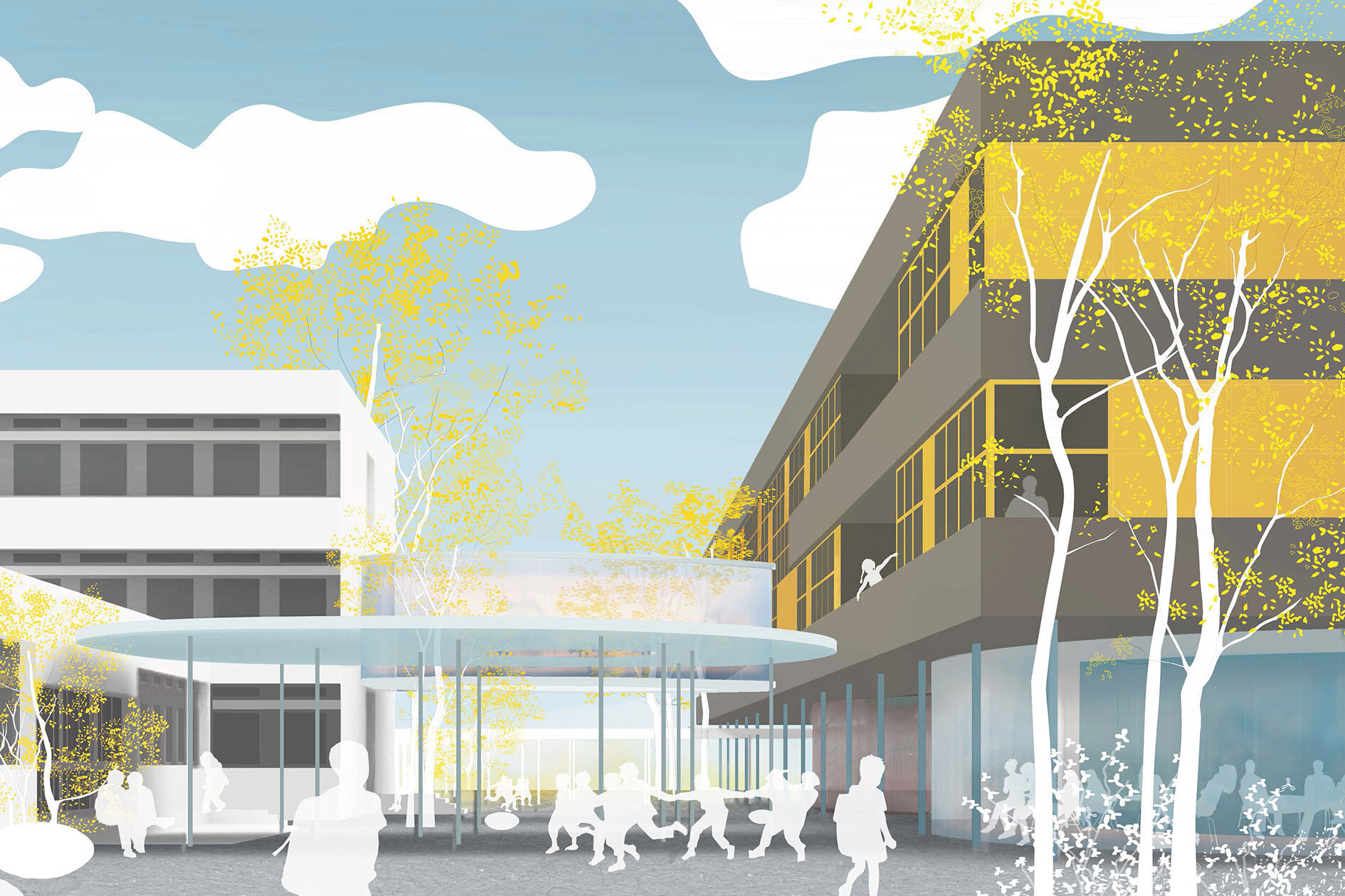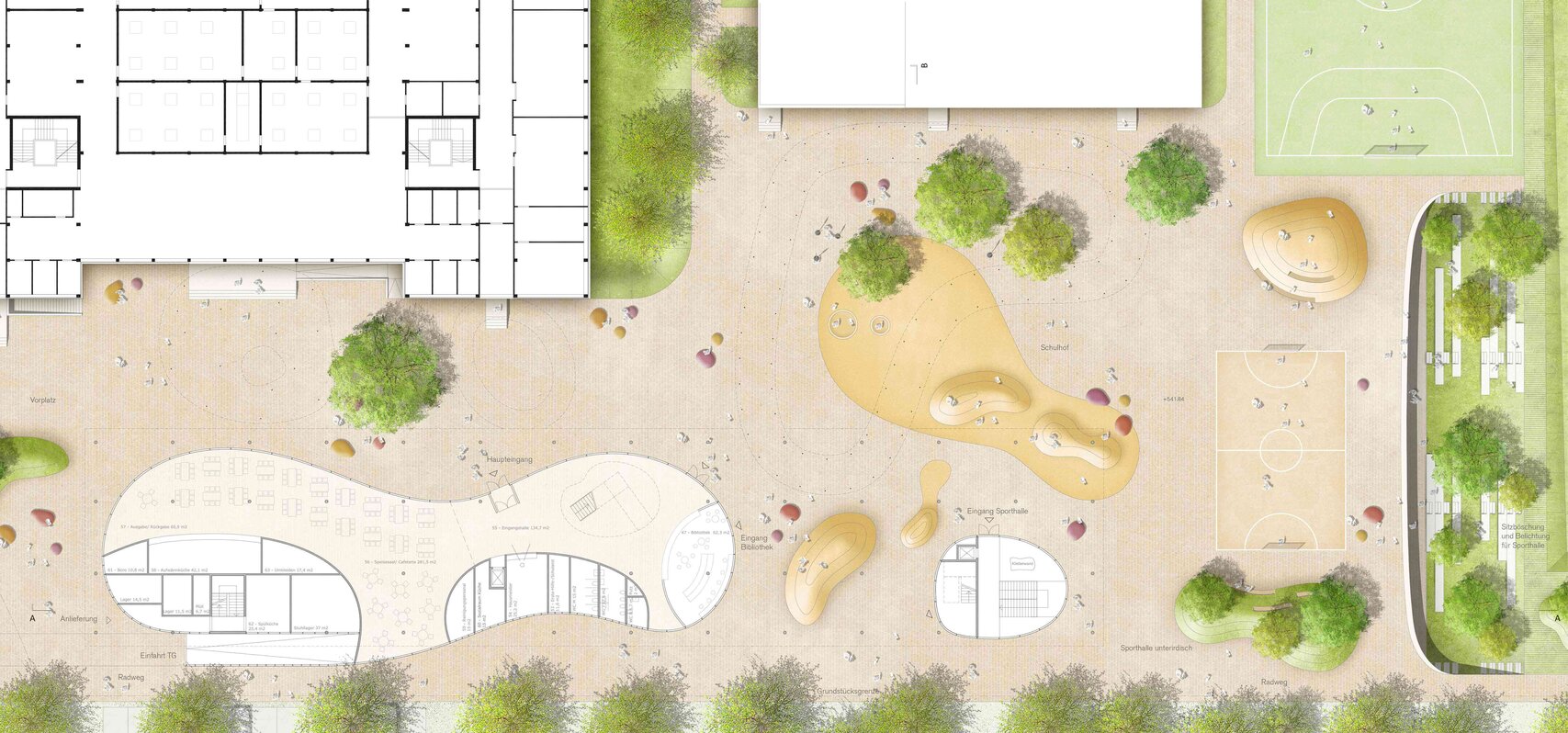 Zwei wesentliche Entscheidungen: Zum einen wird die Sporthalle unterirdisch angeordnet. So entsteht viel Platz für den Pausenhof. Zum anderen wird die gesamte Erdgeschossebene als optisch zusammenhängender Ort der Pause & Erholung ausgebildet. Mit sanft geschwungenen Formen umspielen sich Freiraum und Architektur und schaffen Raum für die Mensa und ein vielfältiges Bewegungsangebot auf dem Pausenhof. Die beiden Obergeschosse bilden darüber ein schützendes Dach – gleichsam als „fliegende Klassenzimmer“.
