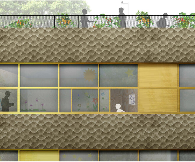 Insbesondere im Rahmen der Ganztagsbetreuung wird Schule sowohl zu Lern-, als auch Lebensraum. Dies erfordert eine vielfältige und identitätsstiftende Behausung. Der Neubau setzt, durch seine warm schimmernden Goldtöne, ein wohltuendes, neues Erkennungszeichen für den Gesamteingang der Grundschule.