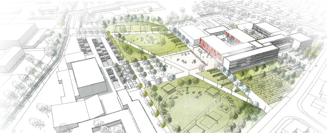 Der neue Schulcampus bleibt autofrei. Alle Stellplätze sind am Rand des Campus geplant. Eltern können Ihre Kinder im Drop Off und Pick UP Bereich sicher am Hauptweg absetzen. Dieser führt direkt zum neuen Haupteingang.