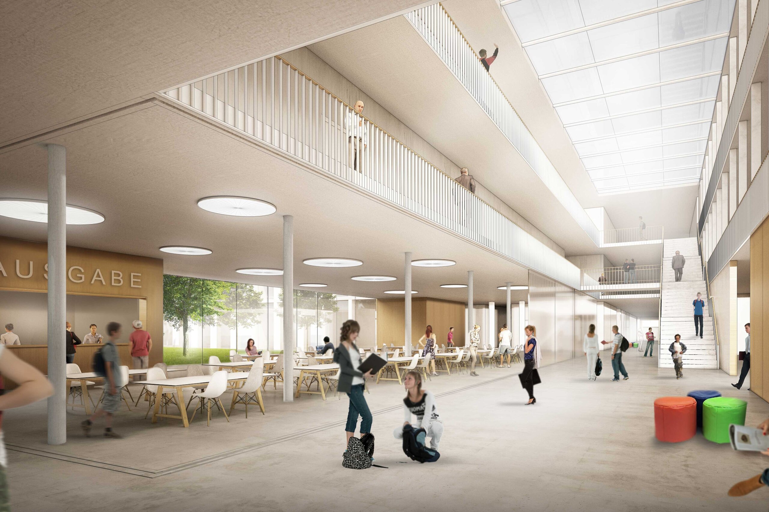 Durch Teilabriss gewinnt das Gebäudeensemble an Kompaktheit und wächst mit dem Neubau zu einem Schulzentrum zusammen. Das Herzstück der Schule ist die lichtdurchflutete Pausenhalle. Als dreigeschossiger Luftraum ist die neue Halle ein qualitätsvoller, einladender Aufenthaltsort. Er schafft eine klare Orientierung im Gebäude. Im Erdgeschoss des neuen Baukörpers befinden sich der Ganztagesbereich sowie die Mensa. Ebenerdig sind auch die Räume für das Schüler- bzw. Selbstlernzentrum angeordnet. In direkter Nähe zum neuen Eingang Süd entsteht der Inklusionsstützpunkt. Das gesamte Erdgeschoss bildet eine lebendige, offene Zone, die den Schülern eine harmonische Lernumgebung bietet.