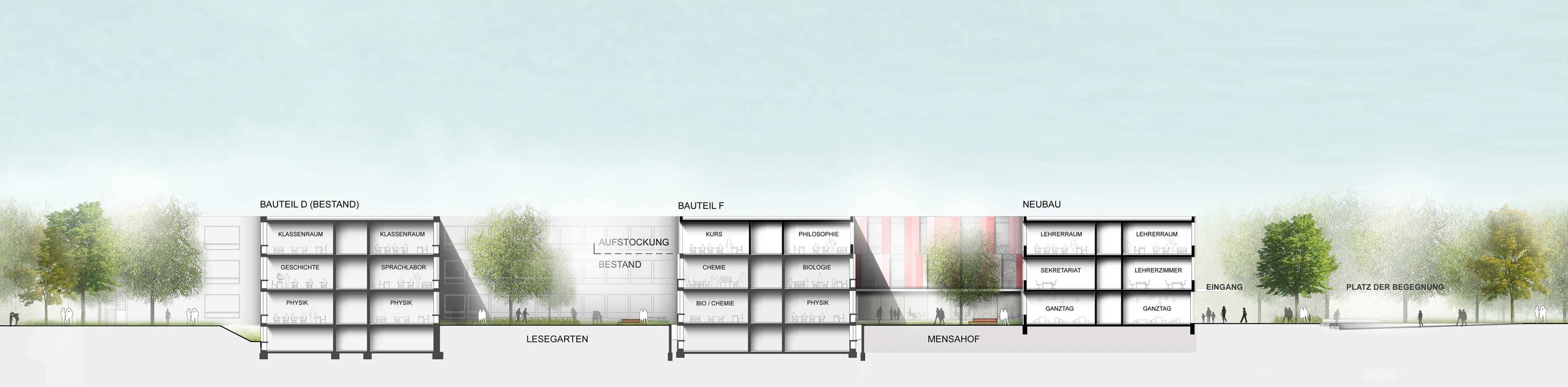 Die Nutzungen von Realschule und Gymnasium im Wesentlichen ist getrennt. Das ermöglicht kurze Wege und bei Bedarf Clusterbildung der Lehrräume. Im Untergeschoss befinden sich Werk-, Kunst-, und Musikräume mit neugestaltetem geschütztem Außenbereich. Die Verwaltungen der Schulen werden im Obergeschoss zusammengeführt und nutzen gemeinsame Räume.