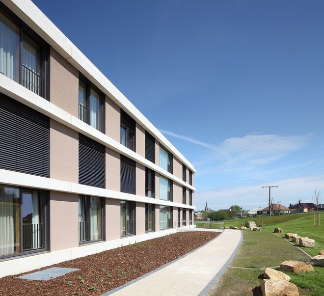 Der teils in den Hang hineingeschobene Sockel wirkt mit seiner Verkleidung aus vorgefertigten Betonelementen massiv. Die darauf ruhenden Baukörper sind in Putz ausgeführt, Gesimsbänder betonen die Horizontale. Kontrastierend sind die Fenster der Bewohnerzimmer in einem stehenden und raumhohen Format ausgeführt, welches einen direkten Außenbezug herstellt. Die Aufenthaltsräume zeichnen sich in der Fassade durch großflächige Panoramaverglasungen ab. Die unterschiedlich tiefen Fensterleibungen und die vorstehenden Gesimsbänder sorgen für ein reliefartiges Licht- und Schattenspiel.