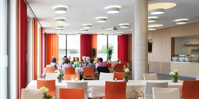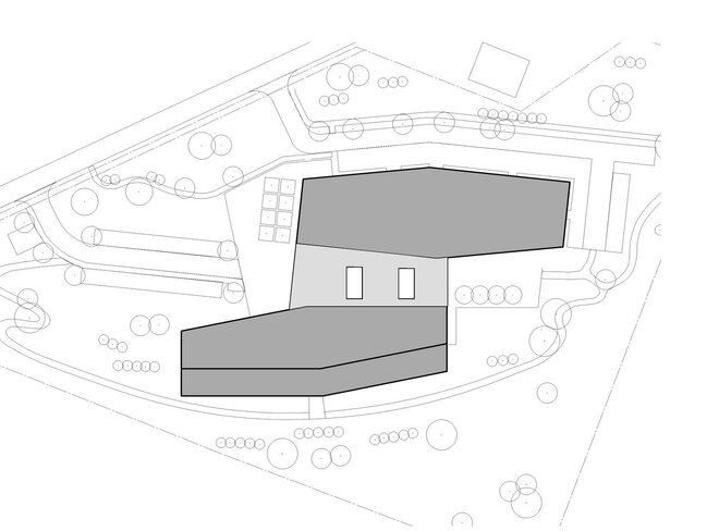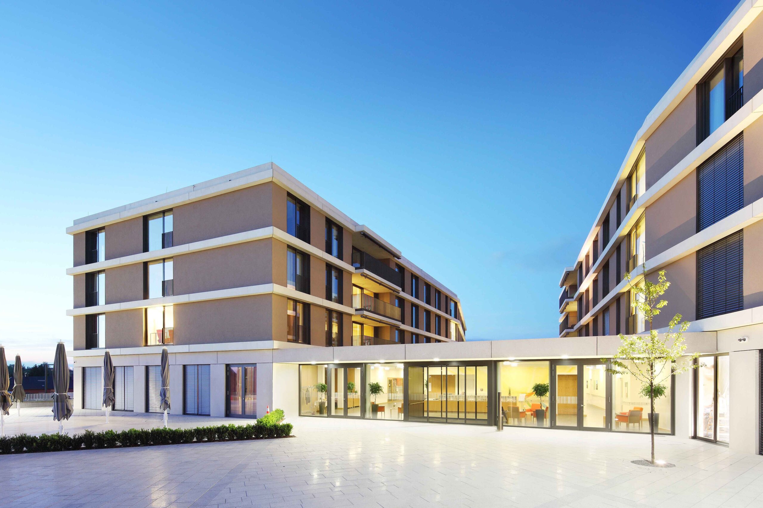 Der Baukörper ruht als Solitär zentral auf dem weitläufigen Grundstück. Er ist in die nach Nordwesten abfallende Hanglage eingeschoben. Die volumetrische Gliederung des Baukörpers in Sockel und Obergeschosse, die Aufteilung der Pflegegeschosse in zwei Häuser sowie die polygonale Konturierung des Gebäudes lassen das Wohnheim nicht nur optisch kleiner erscheinen, sondern optimieren die interne Orientierung und die funktionalen Abläufe. Die beiden dreigeschossigen Baukörper mit den Bewohnerzimmern lagern auf dem Sockel mit den halböffentlichen Nutzungen. Der großzügige, piazzaartige Vorplatz lädt zum Verweilen ein und wird insbesondere durch die angelagerte Brasserie mit Terrasse belebt.