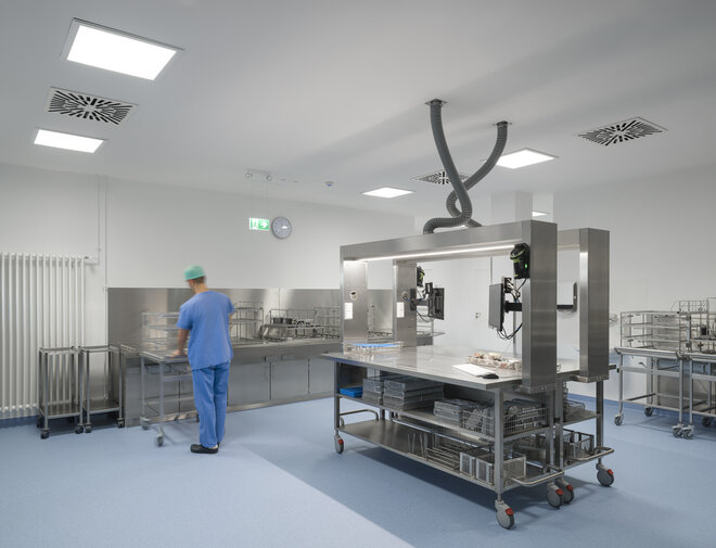 Die Zentralsterilisation, ebenfalls auf Ebene 1, bietet optimale Kapazitäten für den Klinikbetrieb: vier Reinigungs- und Desinfektionsgeräte, eine Containerwaschanlage und drei Sterilisatoren. Durch die direkte Verbindung zur OP-Abteilung konnten kurze Wege für die Sterilgutversorgung realisiert werden. Über die eingebauten Übergabefächer ist auch die Versorgung der Station gewährleistet.