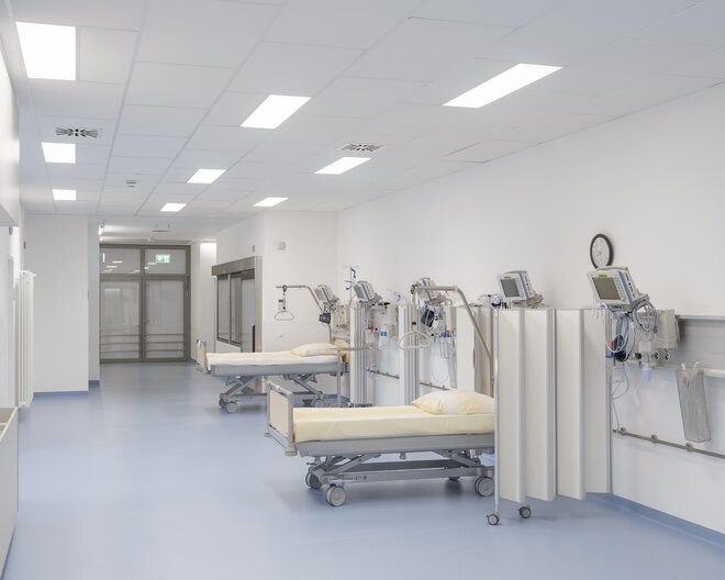 Die Intensivstation liegt in unmittelbarer Nähe des OP-Bereichs und verfügt über eine zentrale Leitstelle. Der direkt angeschlossene Aufwachraum verbessert die postoperative Versorgung und optimiert Arbeitsabläufe für das Pflegepersonal.