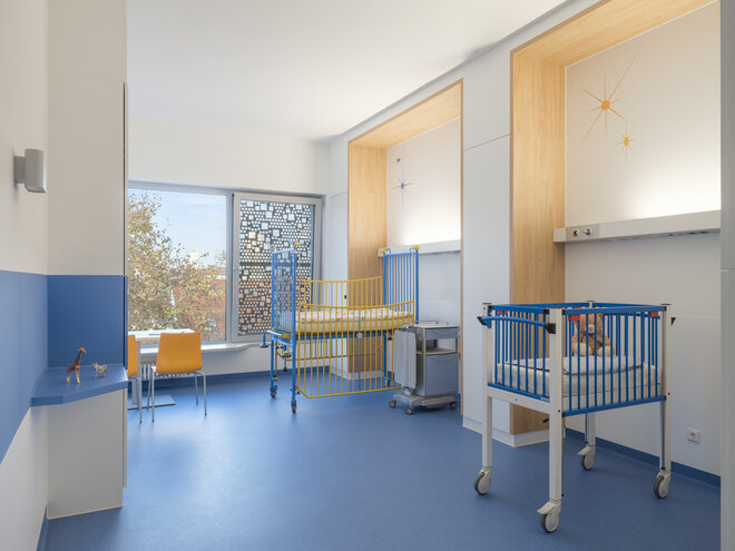 Auf der zweiten Ebene wurde die Kinderklinik eingerichtet. Zwei separate Zugänge vom zentralen Treppenhaus ermöglichen eine gezielte Trennung infektiöser und nicht-infektiöser Patienten. Die Station umfasst 43 Betten, verteilt auf Ein- und Zweibettzimmer.