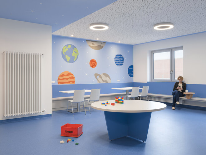 Ein besonderes Highlight stellt das Gestaltungskonzept "Universum" dar, das eine angenehme Umgebung für die kleinen Patienten schafft. Farben des Himmels, Wolken und Sternbilder erzeugen eine beruhigende Atmosphäre. Zudem wurden die Sternbilder als Orientierungssystem in der Station umgesetzt, um eine intuitive Wegeführung zu gewährleisten.