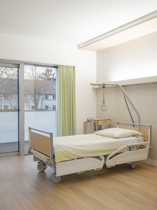Die Palliativstation wurde bewusst im Erdgeschoss platziert und verfügt über einen separaten Eingang, um Angehörigen mehr Privatsphäre zu bieten. Neben den Patientenzimmern wurde ein Raum für Musiktherapie integriert. Vorgelagerte, barrierefreie Balkone bieten Patienten die Möglichkeit, frische Luft zu genießen.