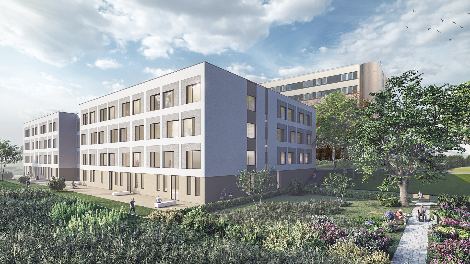 Neben vier psychiatrischen Stationen – Gerontopsychiatrie, Allgemeinpsychiatrie, Suchtstation und Psychotherapie – umfasst der Anbau eine Tagesklinik mit vielfältigen Angeboten, die Geriatrie sowie eine Geburtshilfe mit zwei Kreissälen und angrenzender Wöchnerinnenstation.