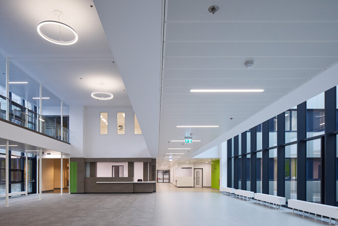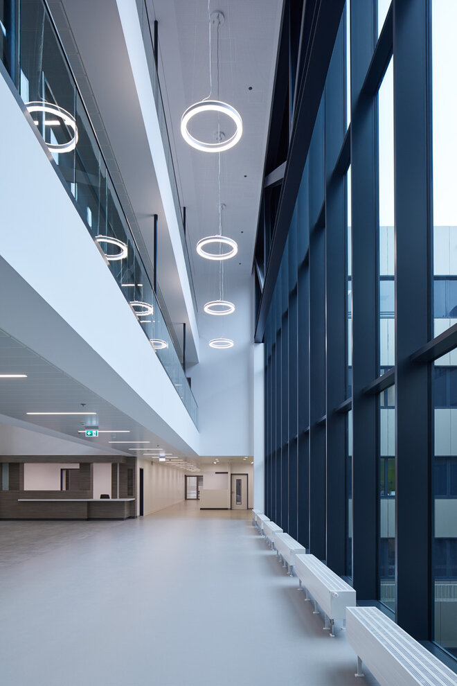 Eine gläserne Eingangshalle bildet den neuen Auftakt. Direkt neben dem Eingang gibt es neue Isolierzimmer und eine Aufnahmestation für Patienten. Vor allem nächtliche Neuzugänge können so störungsfrei aufgenommen werden.