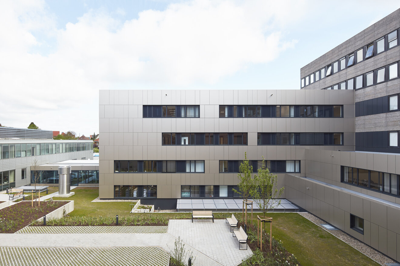 Eine großzügige Cafeteria mit Sitzplätzen im Freien empfängt die Besucher. In der zweiten Ebene zieht die neue Intensivstation ein. Als Bindeglied zwischen der Intensiv- und Normalpflege wird die sogenannte Intermediate Care (IMC), die Zwischenpflege, untergebracht sein. Auf der dritten Ebene ergänzt die neue, gemeinsame Station der Klinik für Kardiologie und der Klinik für Allgemeine Innere Medizin und Gastroenterologie die Funktionsbereiche des Bestandes mit 56 Betten.