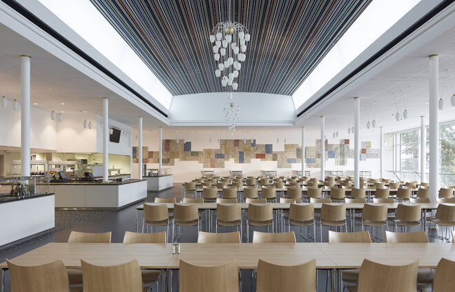 2018 wurde die Grundinstandsetzung des gesamten Gebäudeensembles mit der Sanierung und Modernisierung des sogenannten Kasinos, einer Mensa, die Mitarbeiter und Gäste versorgt, abgeschlossen. Mit dem Bestand ist das Kasino über einen nachts auffällig leuchtenden Gang verbunden. Eine Lichtskulptur entsteht. Trotz der umfangreichen Maßnahmen bleibt der Charakter der 50er Jahre in vielen Details der Materialien, Proportionen und Ausstattungen wie die markanten roten kleinen Mosaiksteine als Wandbesatz oder das Wandmosaik und der imposante Leuchter im Saal erhalten.