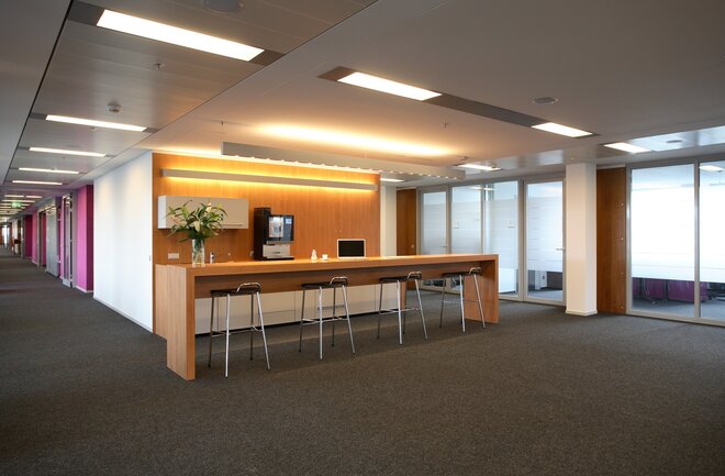 Für die Konzeption der zukunfts­orientierten Büroarbeitsplätze war die Verbesserung der Qualität der Flure entscheidend. Die vorhandenen schmalen, schlecht belichteten und akustisch unbefriedigenden Gänge werden zu Zonen für Kommunikation und Besprechung, in denen sich die Mitarbeiter gern aufhalten und arbeiten. Die gemauerten Flurwände wurden durch raumhohe Verglasungen ersetzt, die tragenden Stützen freigestellt. Dadurch fällt Tageslicht durch die Büros in die Flure und Kommunikationszonen. Kräftige pinkfarbene Akzente, tragen nachts das moderne Innere auch nach außen.